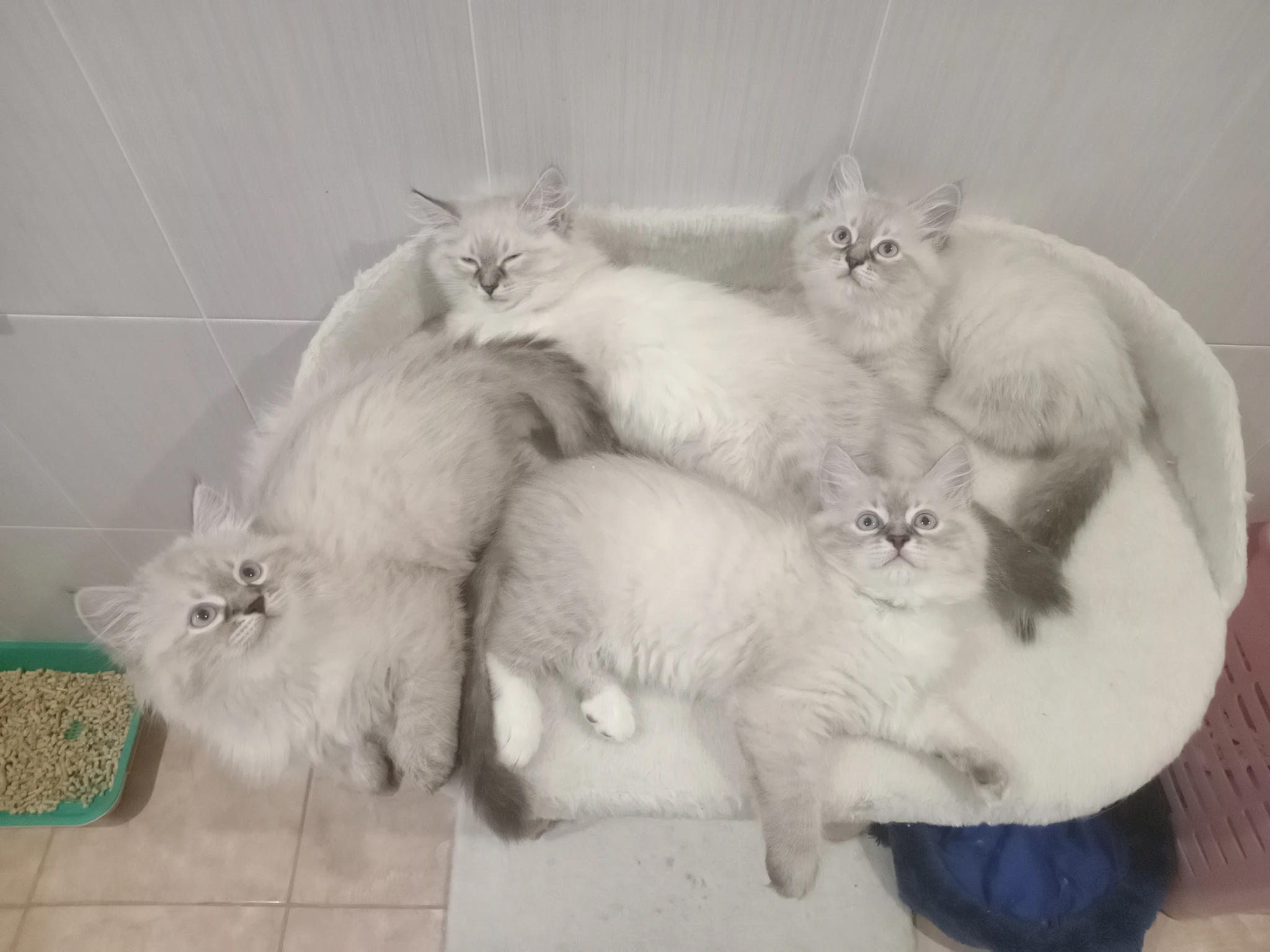Вот 4 белых коника. Побывали в клубе, показали пострелят эксперту. Сказали, что очень ладные и толстопопые котята, оформили на них метрику, получили букву Би. Двоим котятам их хозяева уже дали имена Барон и Барс