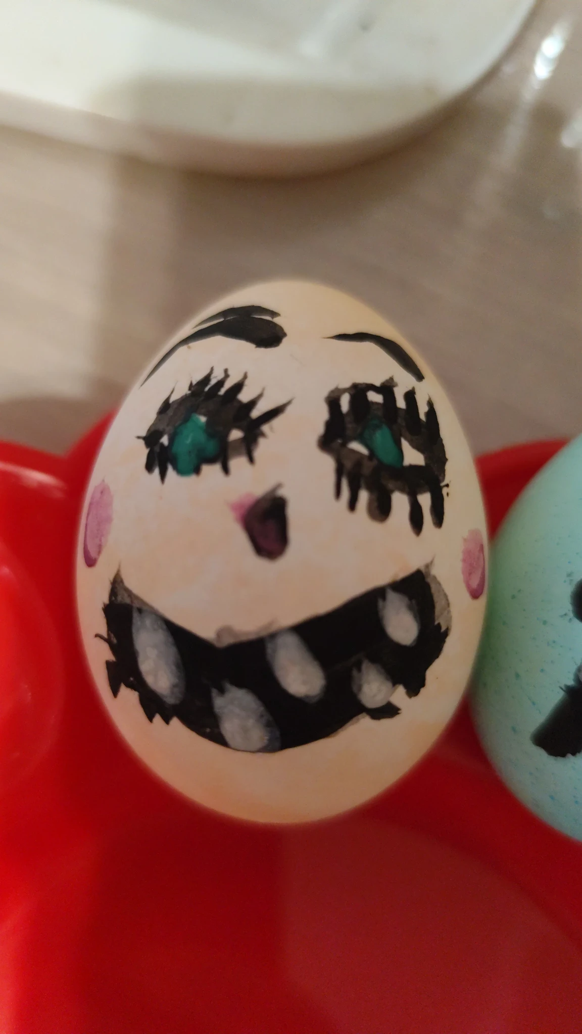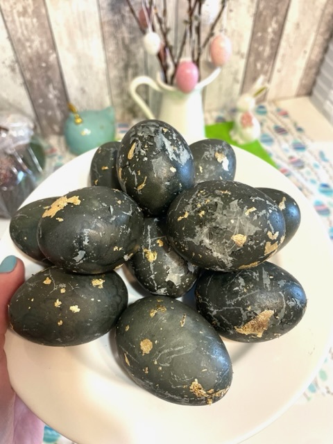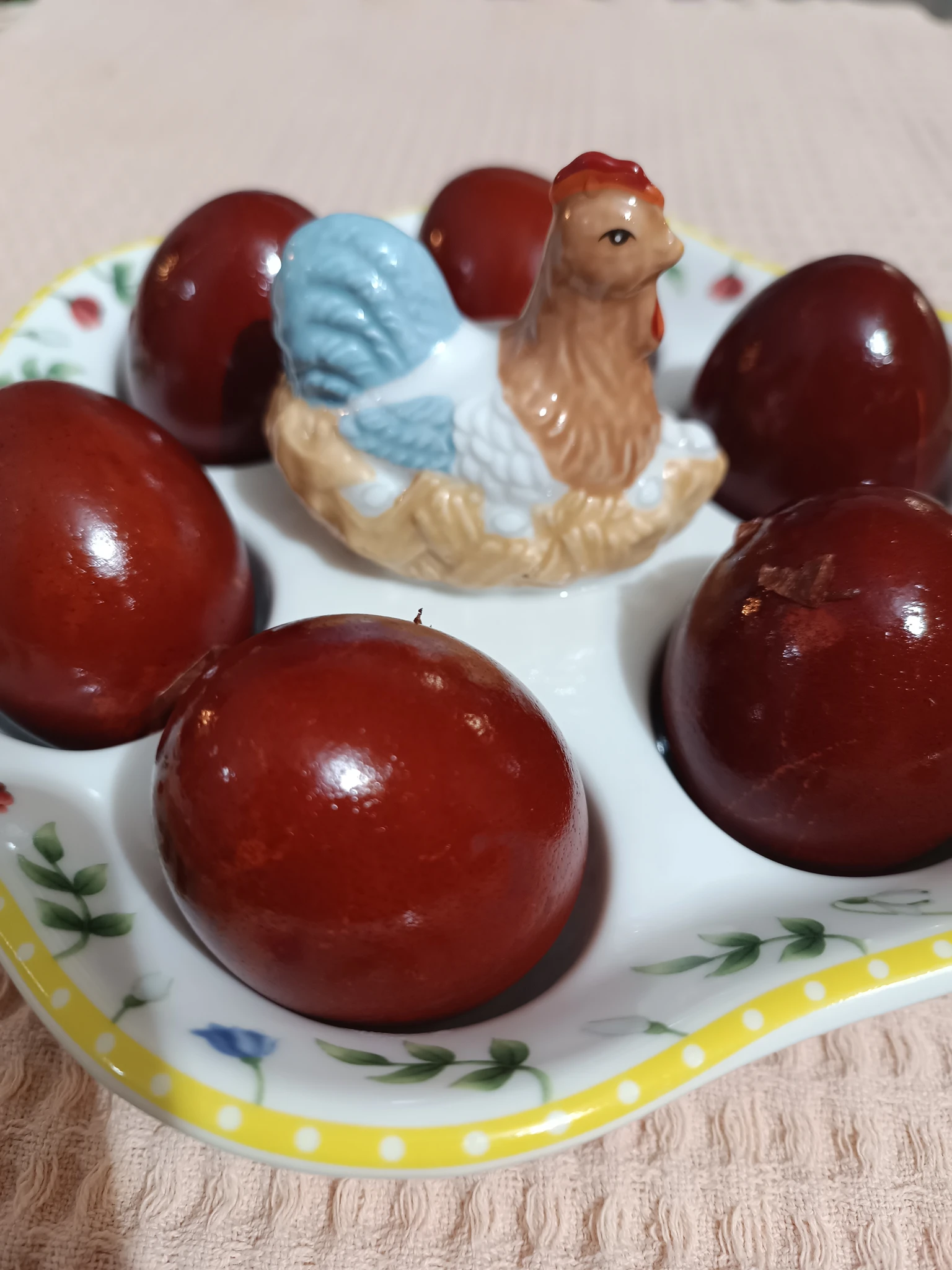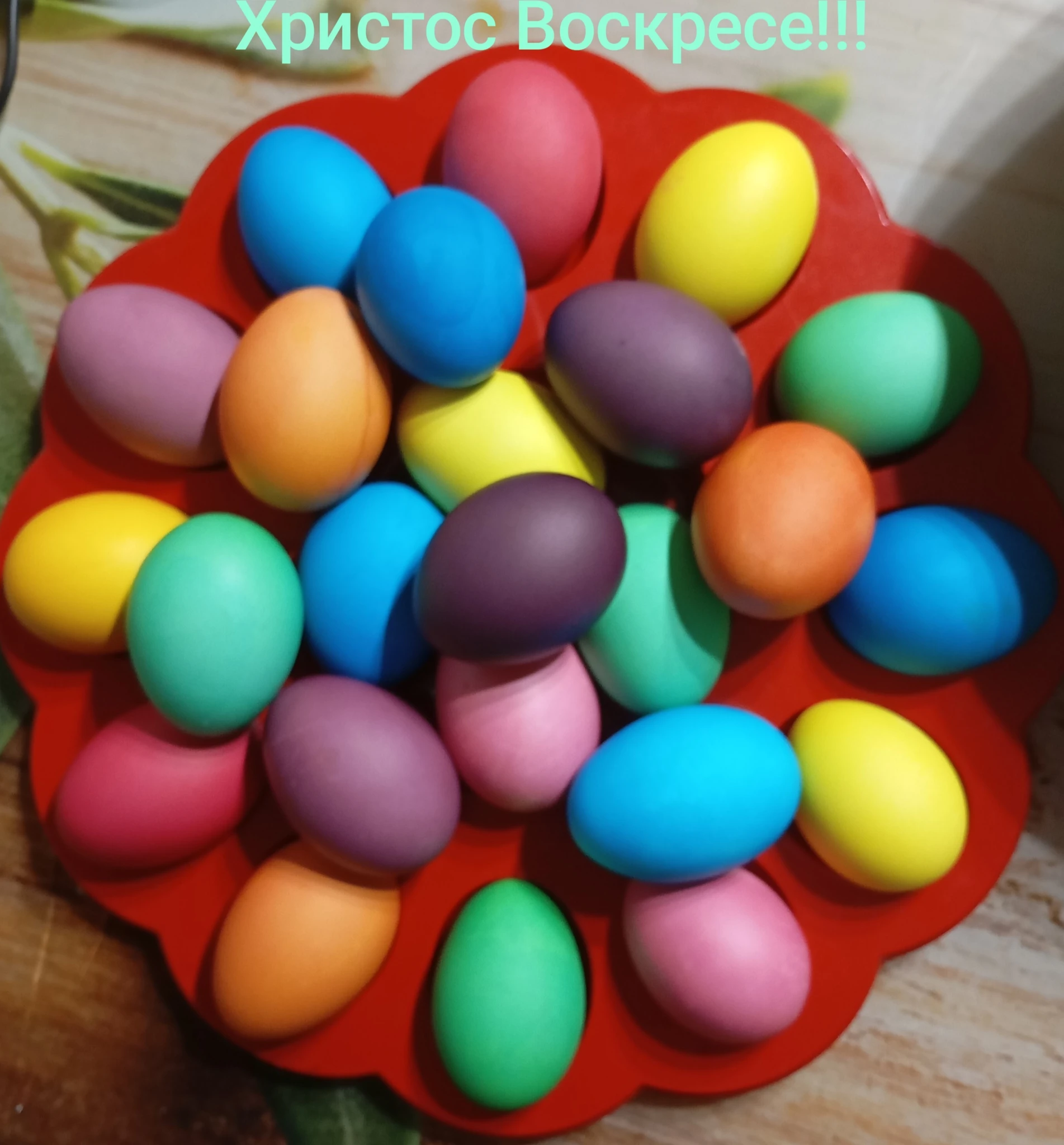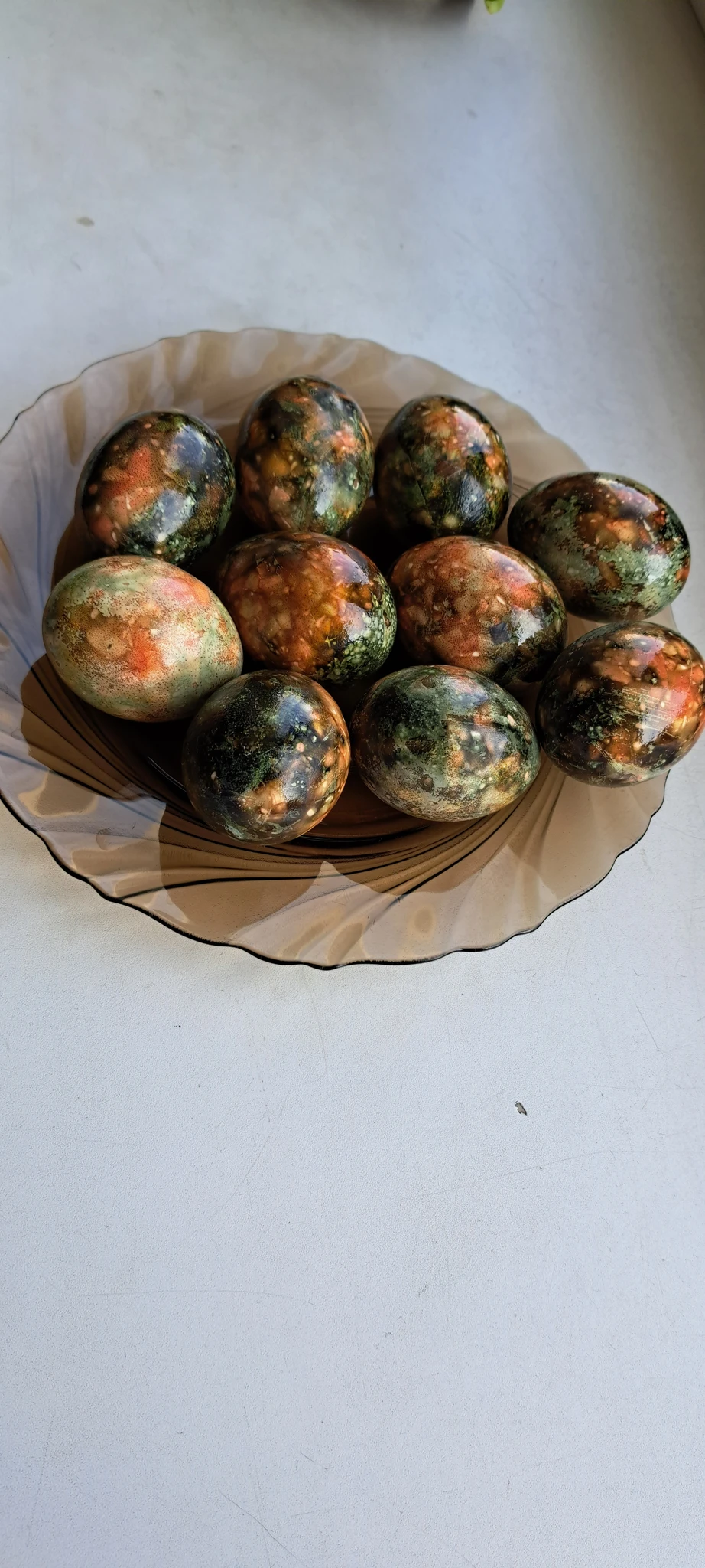 Сестра яйца красила от своих кур натуральными красителями. В том числе своим домашним вином(черные).