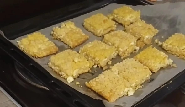 Горячий корж разрезать на печеньки.