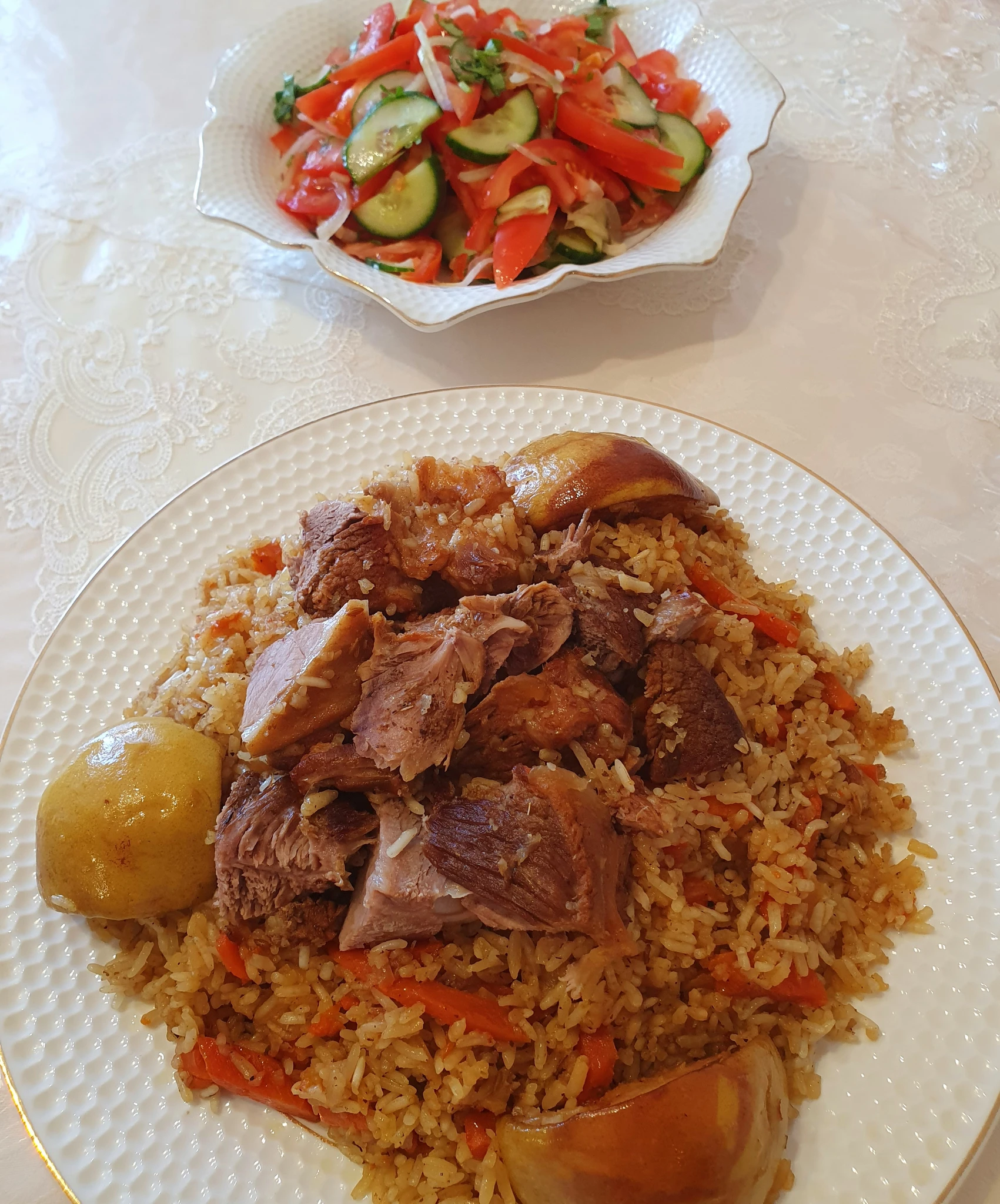 У нас сегодня плов с бараниной и айвой. И окрошка со вчерашнего для осталась.