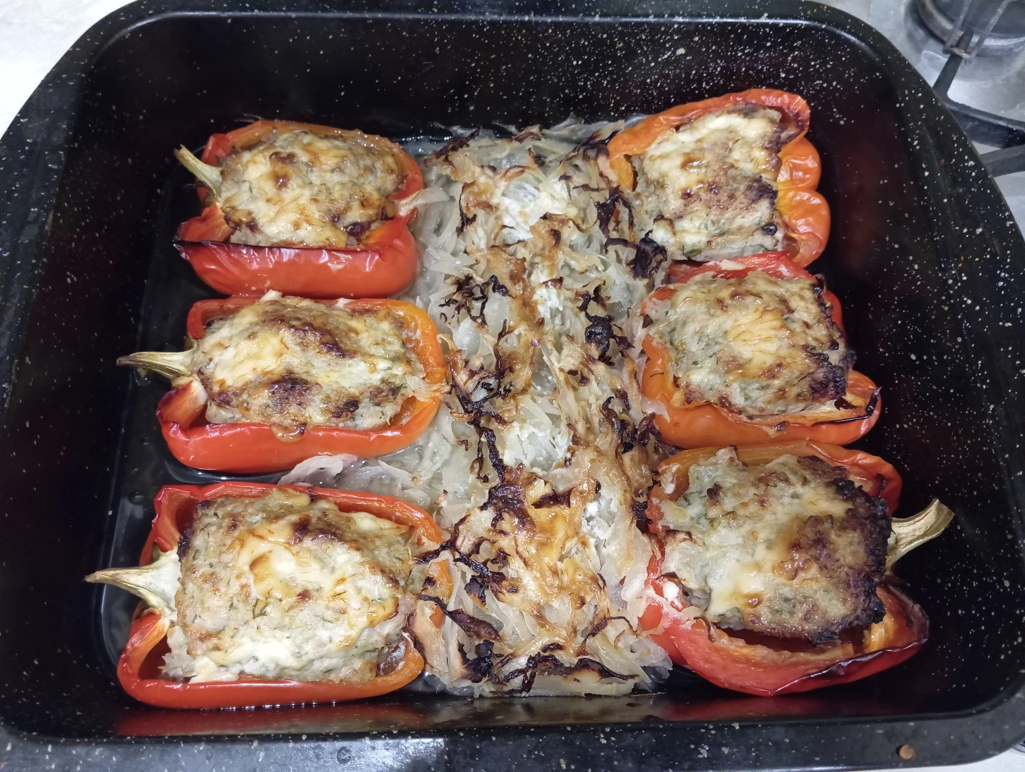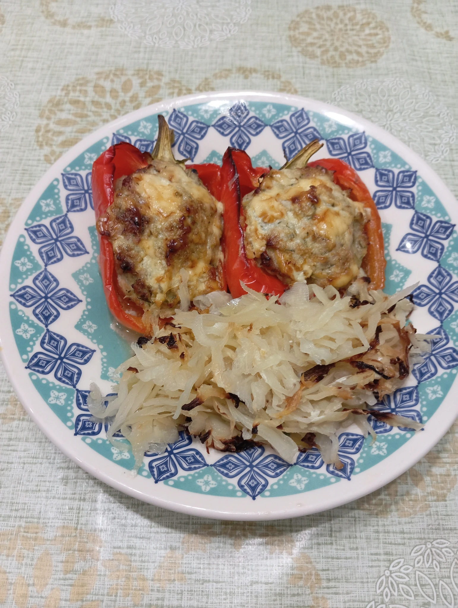 Перец фаршированный, обычно я в кастрюле с бульоном варю, сегодня запекала в духовке, на свободное место на противне нашинковала капусты, помолилась т9 посолила, чуток майонеза