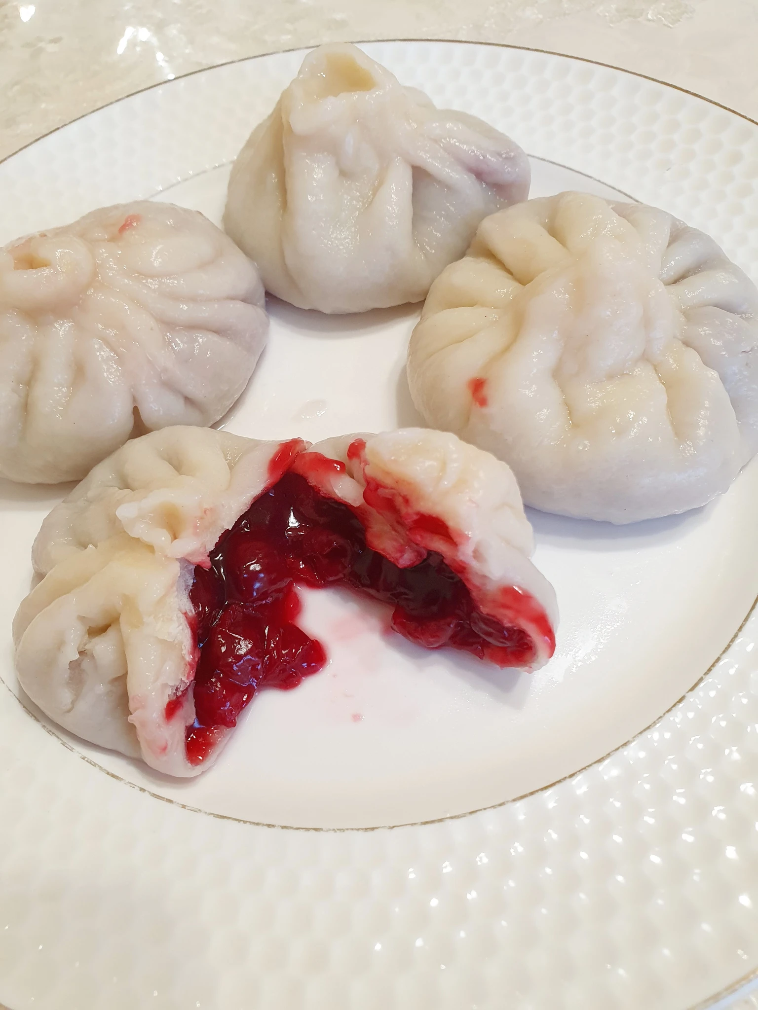 С младшей дочкой сделали себе хинкали с вишней, из остального теста вареники налепила и заморозила. Хинкали хорошо, но вареники привычнее.