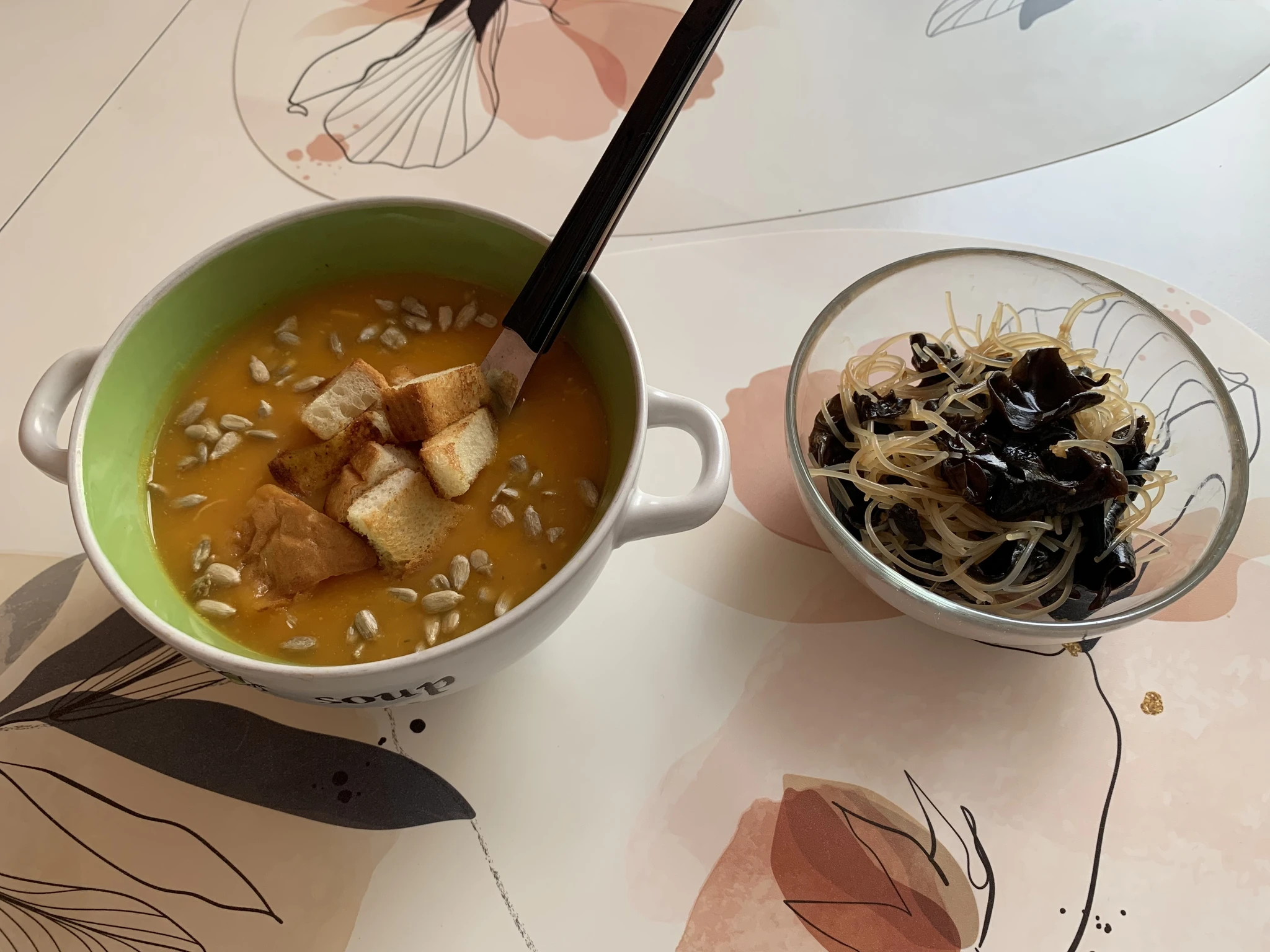 На обед суп-пюре тыквенный, фунчоза с древесными грибами.