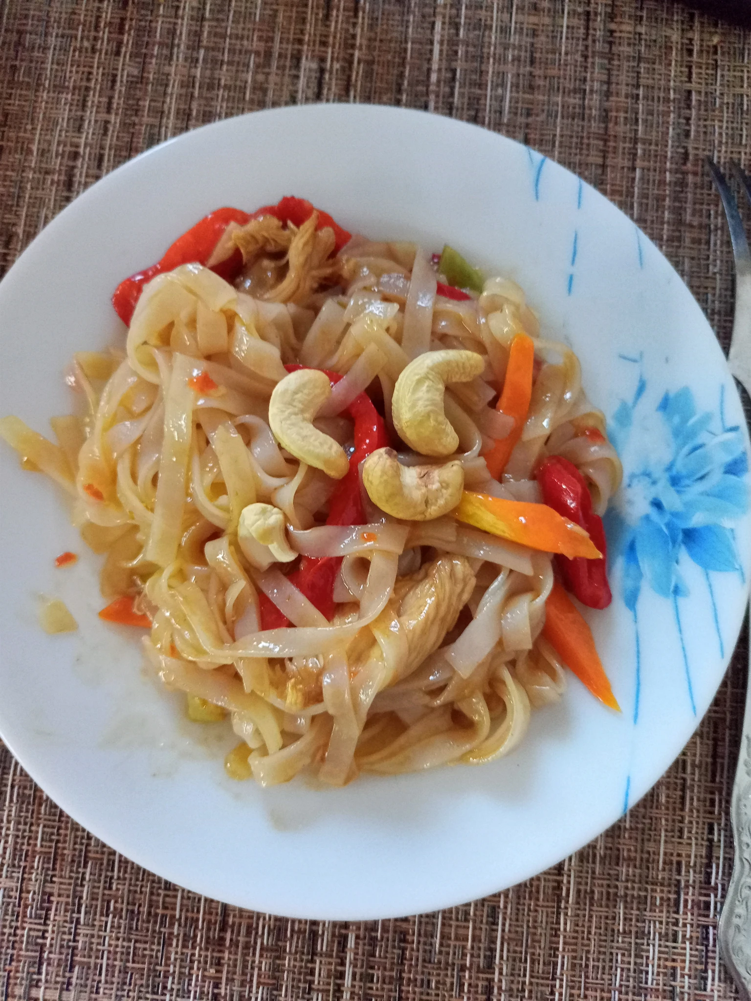 Лапша с курицей в остросладком соусе в тайском стиле .