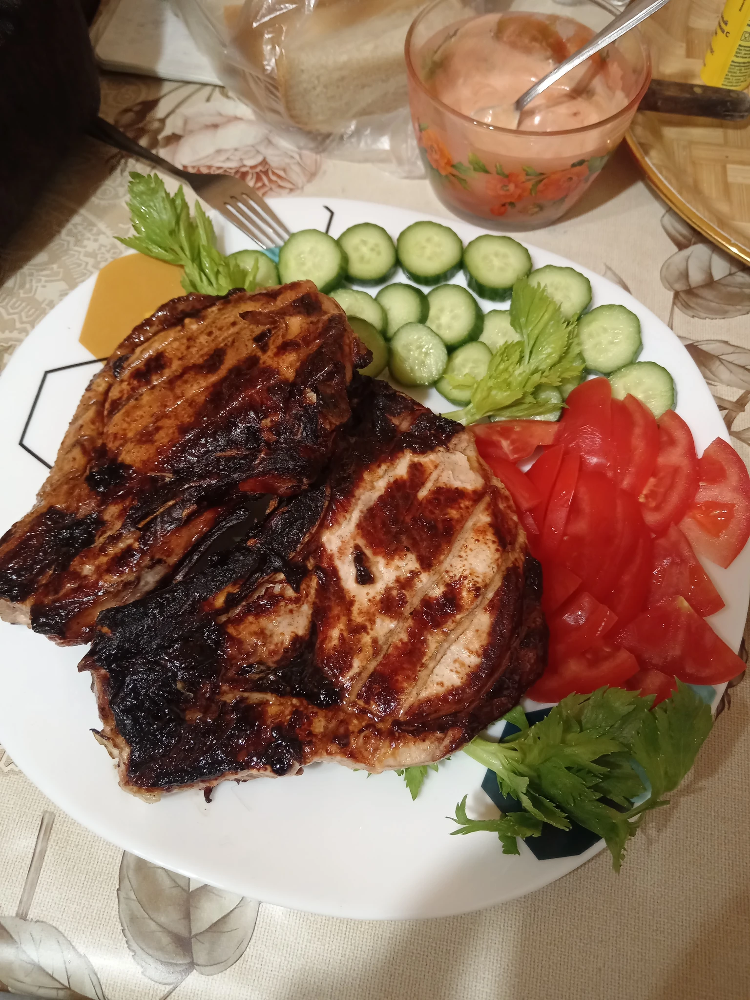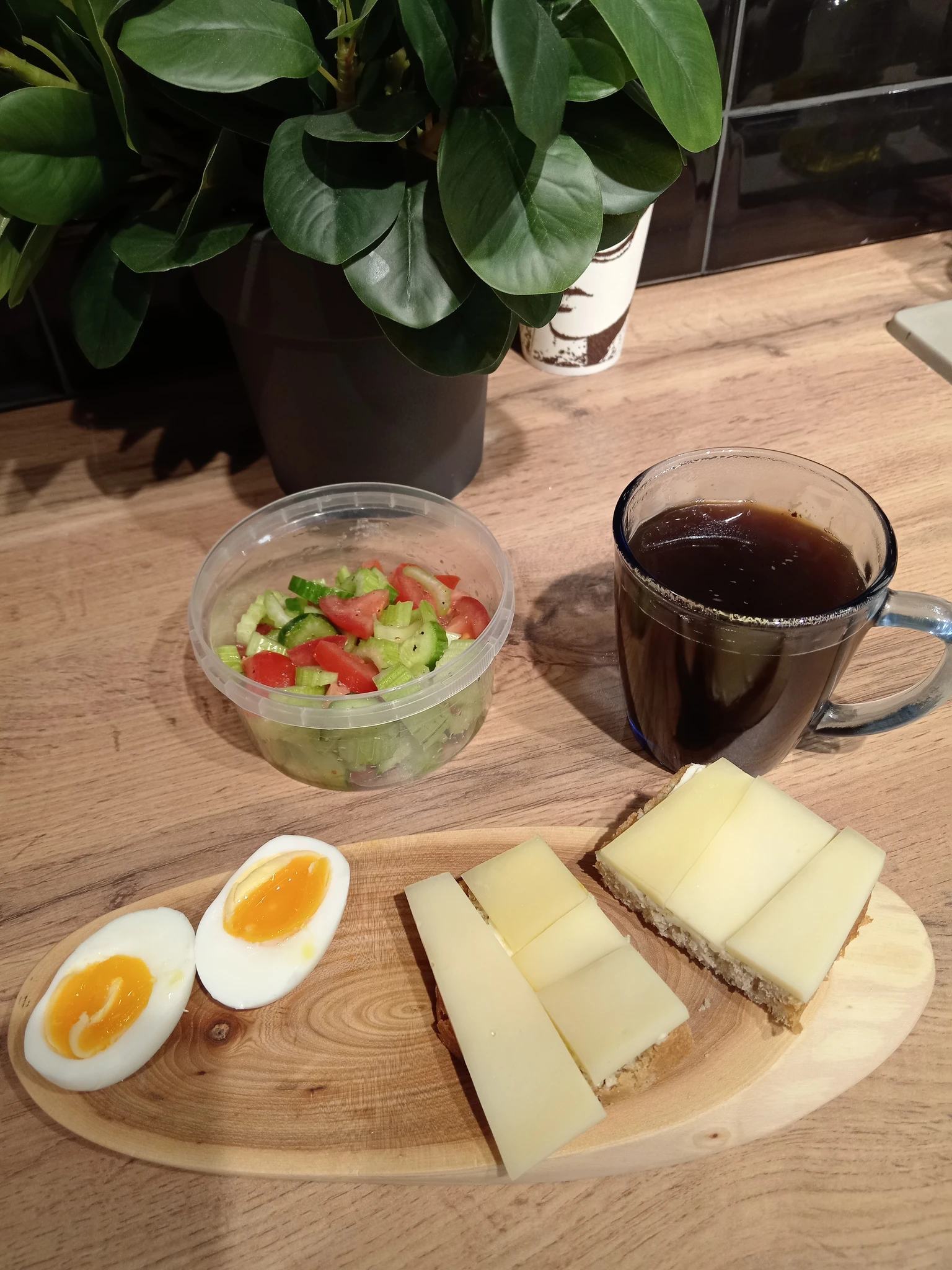 Добрый день, сегодня на завтрак немного вчерашнего мяса осталось яйцо и салат, у мужа тоже это, но он раньше завтракал