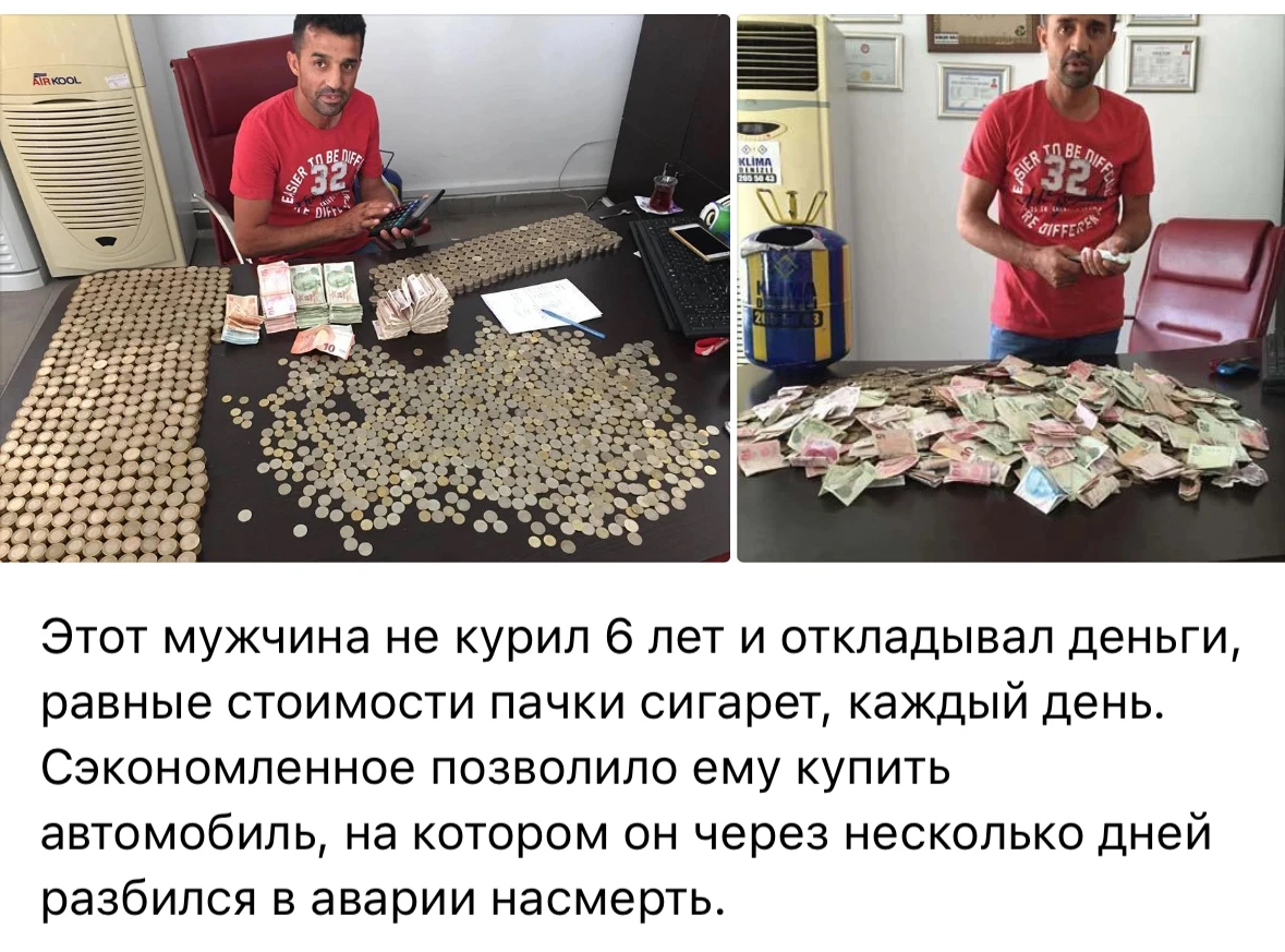 Всегда вспоминаю случай, как на заводе один мужик копил на квартиру, в столовой на обед покупал себе макароны с подливой. Накопил 2,5 миллиона и умер, не успев ими распорядиться