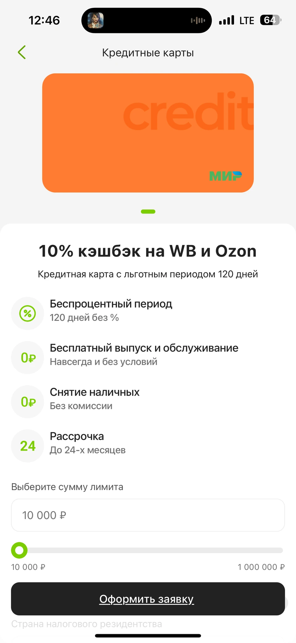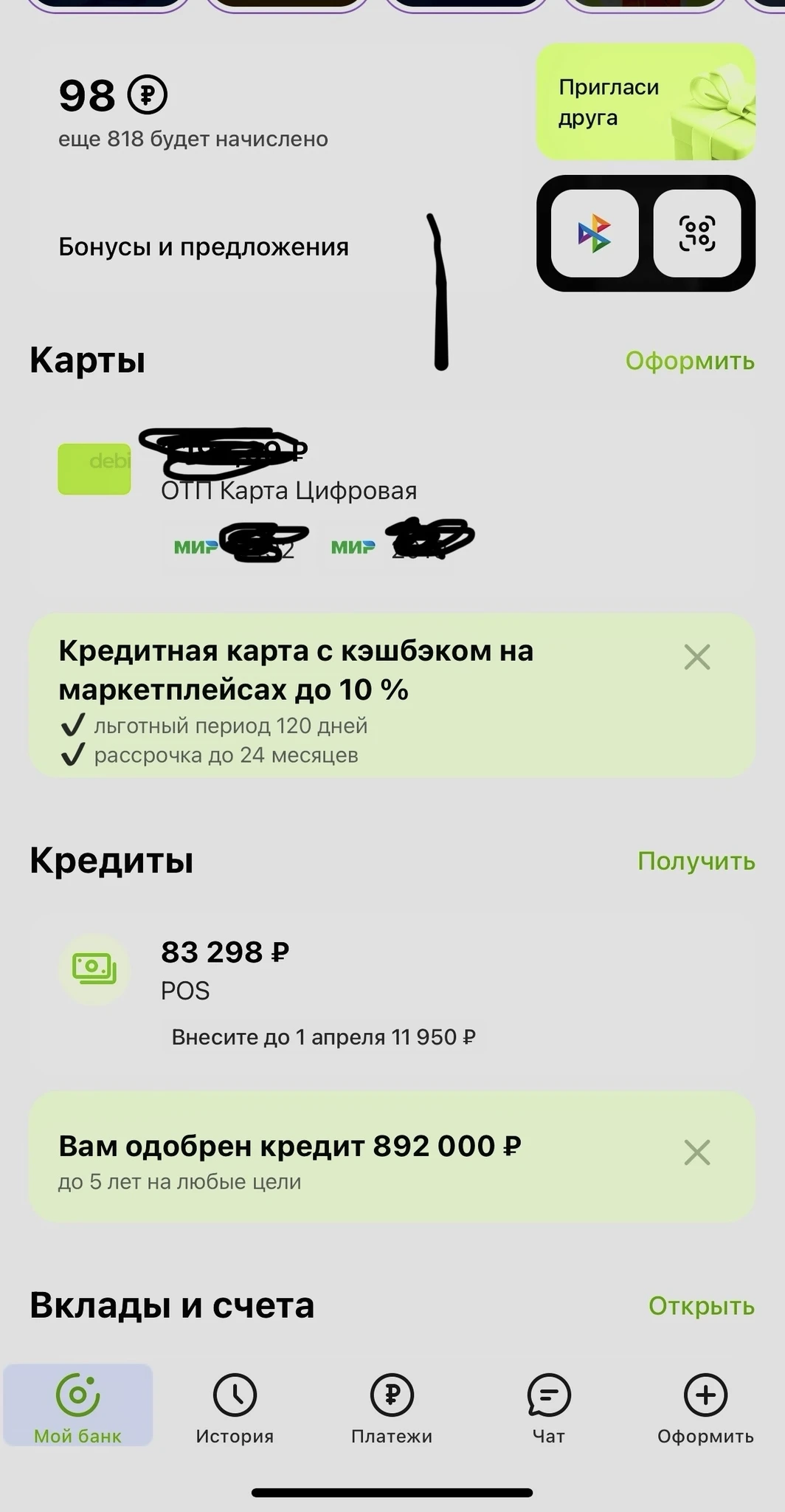Сегодня выпала реклама кредитки Отп, 10% озон и вб, обслуживание бесплатное, беспроцентный период 120 дн вроде, ну на первый взгляд никаких подводных камней