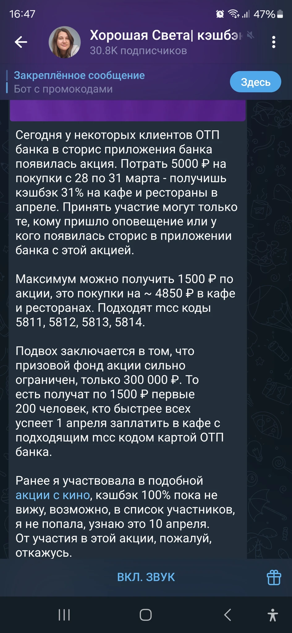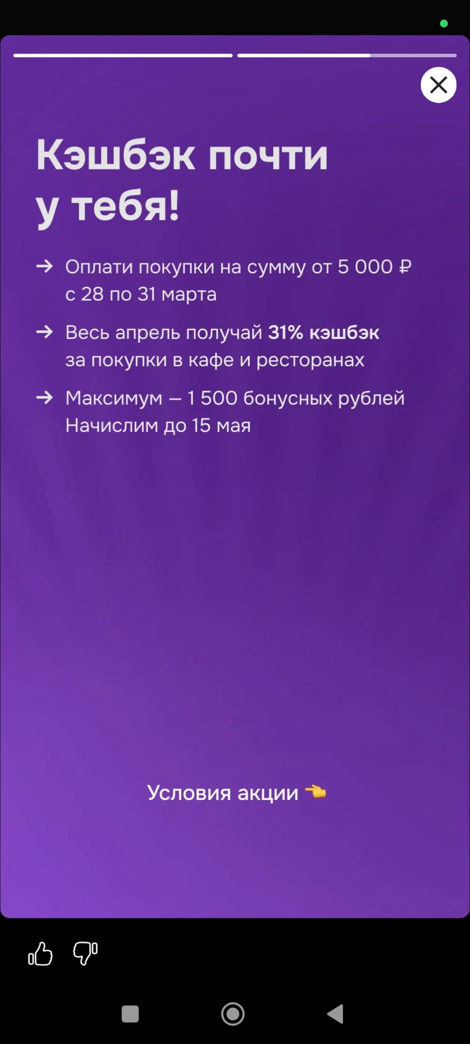Потратить от 5 тыс до 31 марта и будет кэш в ресторанах и кафе 31% (максимум 1500 руб)