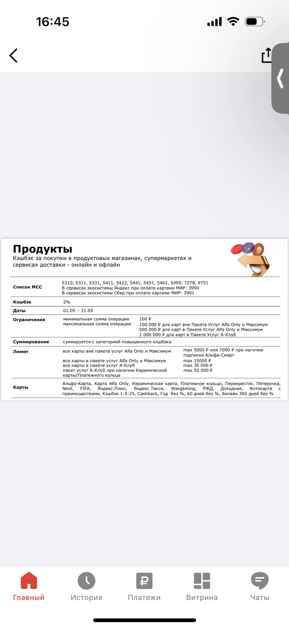 Мне в Альфа барабане выпали 2% на продукты)) Супермаркеты и продукты в системах Яндекс и Сбер.