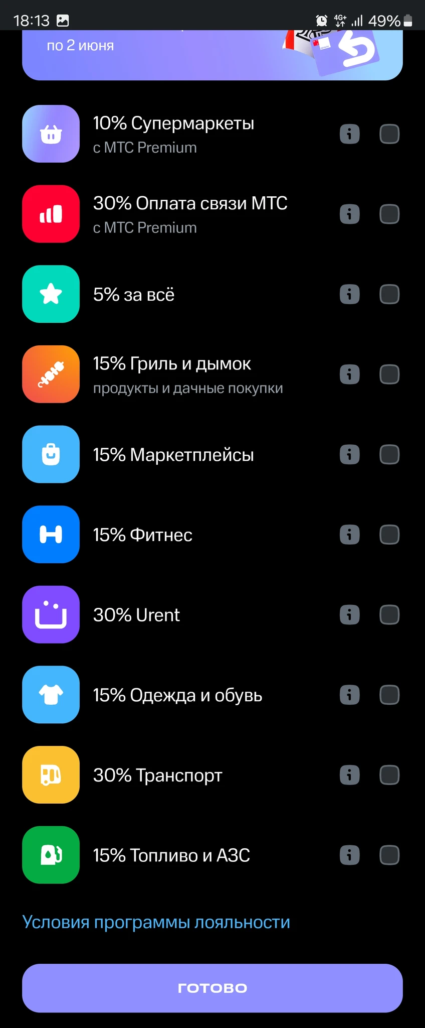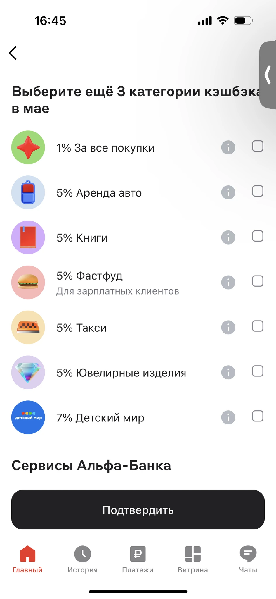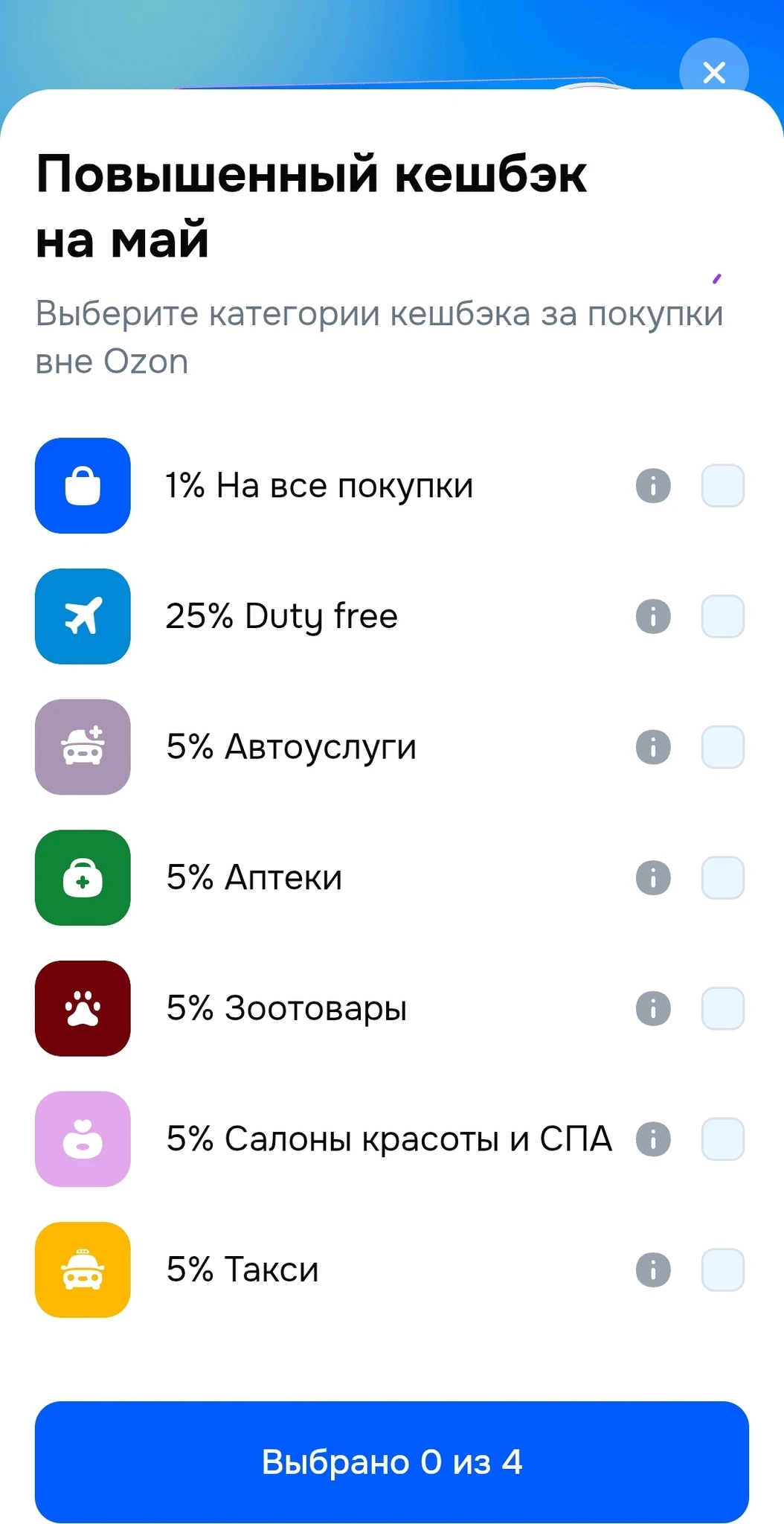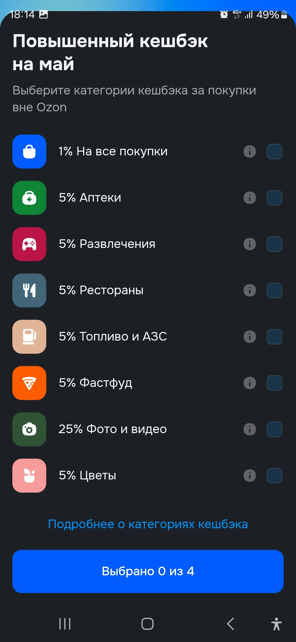 • Из перечня доступных категорий исключены «Аптеки» и «Мойки и шиномонтаж». Вместо них появились категории «Книги и канцтовары» (5%) и «АЗС» (3%).