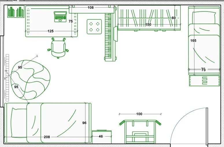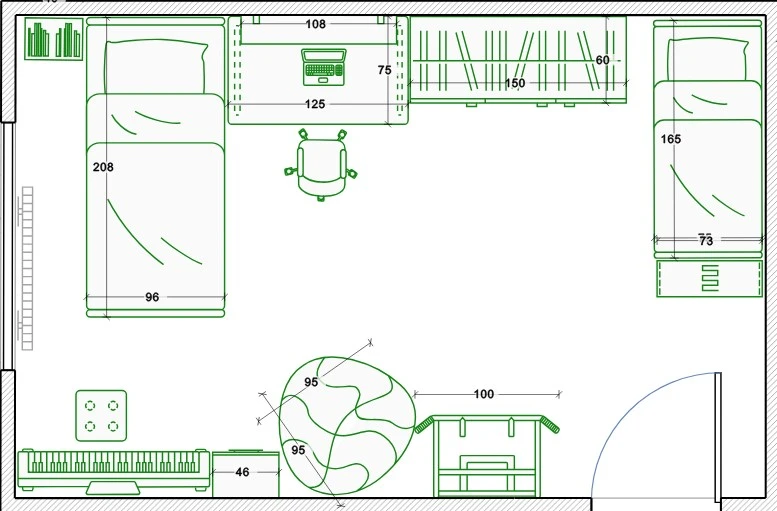 У дочери-подростка сейчас точно такая же по площади и планировке комната, только дверь внутрь комнаты открывается, а не в коридор, как у Вас. Мебель -стандартный набор: стол, стул, диван, стеллажи. Дочь пробовала разные варианты расстановки мебели, пока не нашла для себя оптимальный, благо, что всё не тяжелое и переставляется буквально за час.