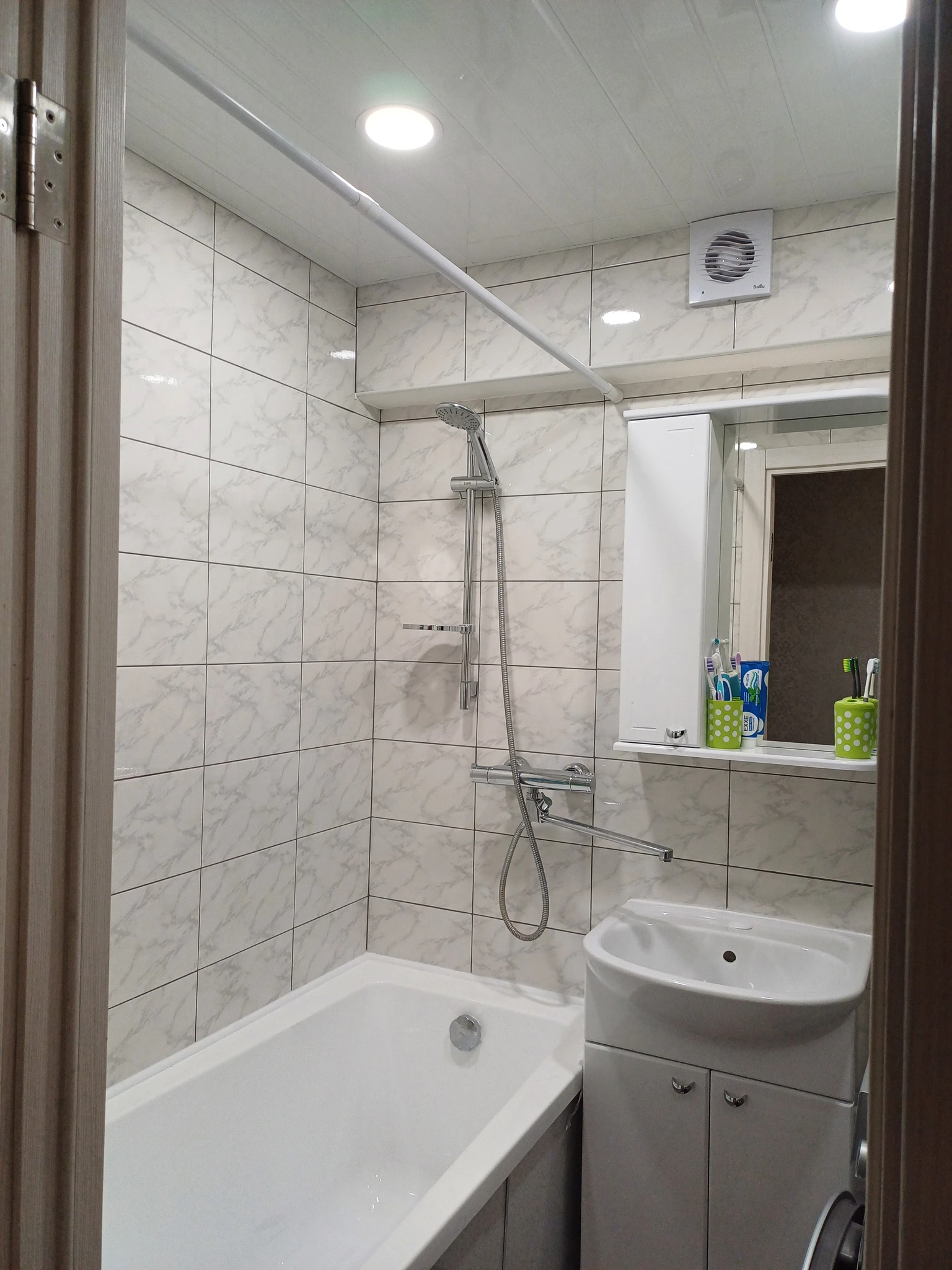 Это у нас ещё общие стояки труб меняли (из-за этого и начали ремонт), жили тут же муж, я и 2 детей сделали все в итоге примерно за месяц - полтора. Очень бюджетно и не особо модно, но зато все новое и чистое. На зелёные стаканы не смотрите, заменили их уже