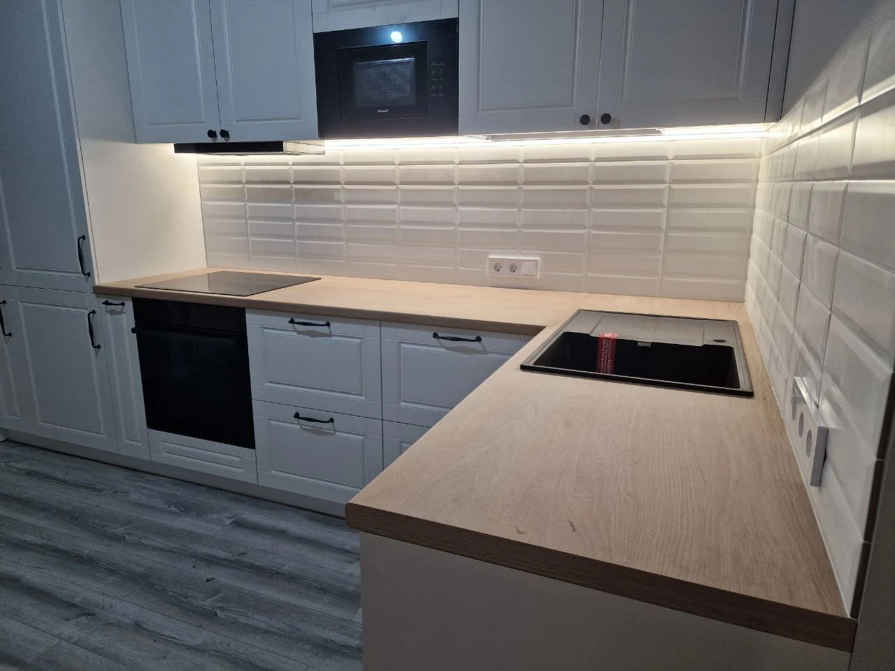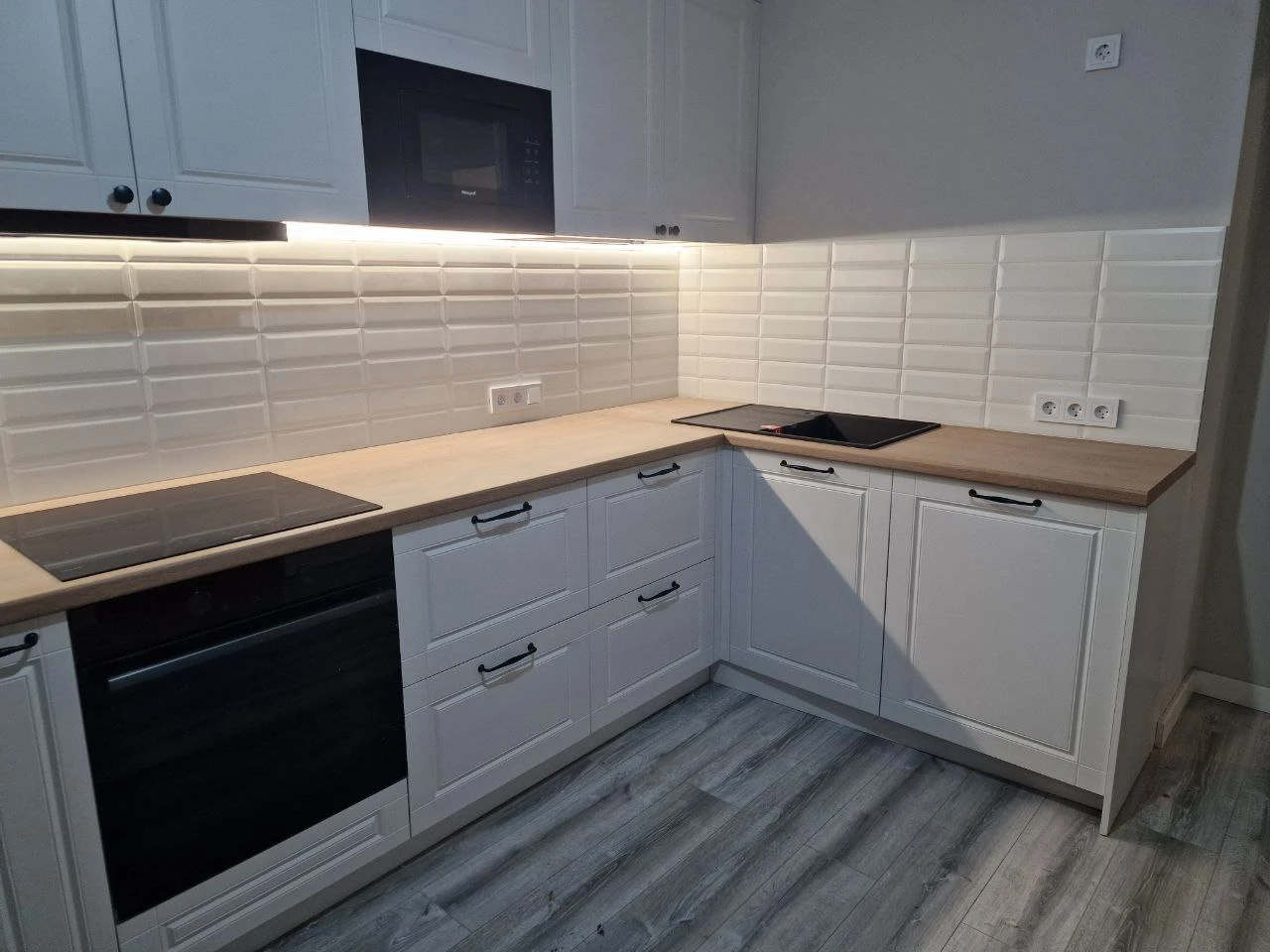 У меня икеевская такая кухня и плитка кабанчик, только белая с кофейными чашечками.