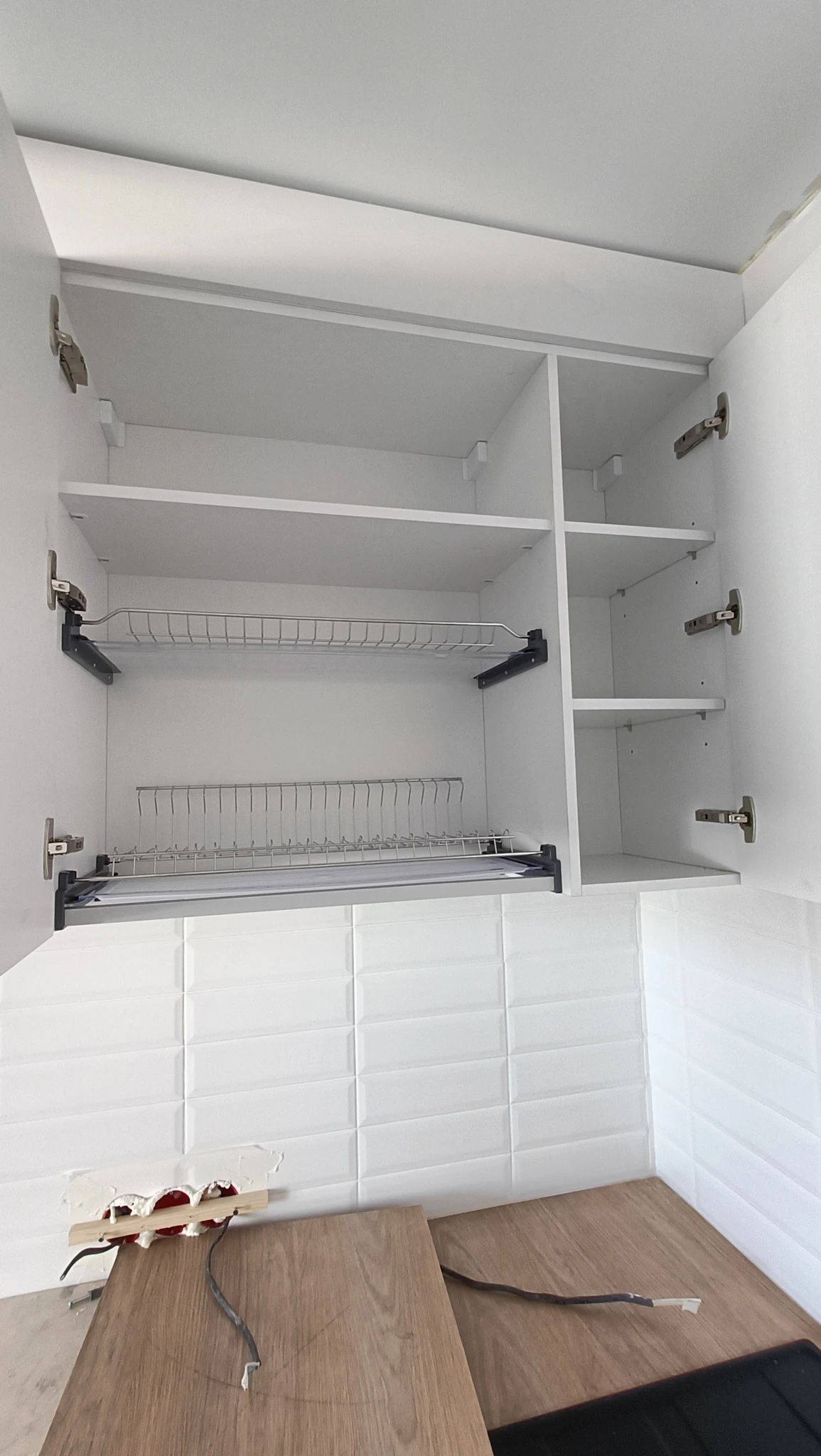 Во всех шкафах полки переставляемые - можно регулировать высоту полок. Сушки привезут позже
