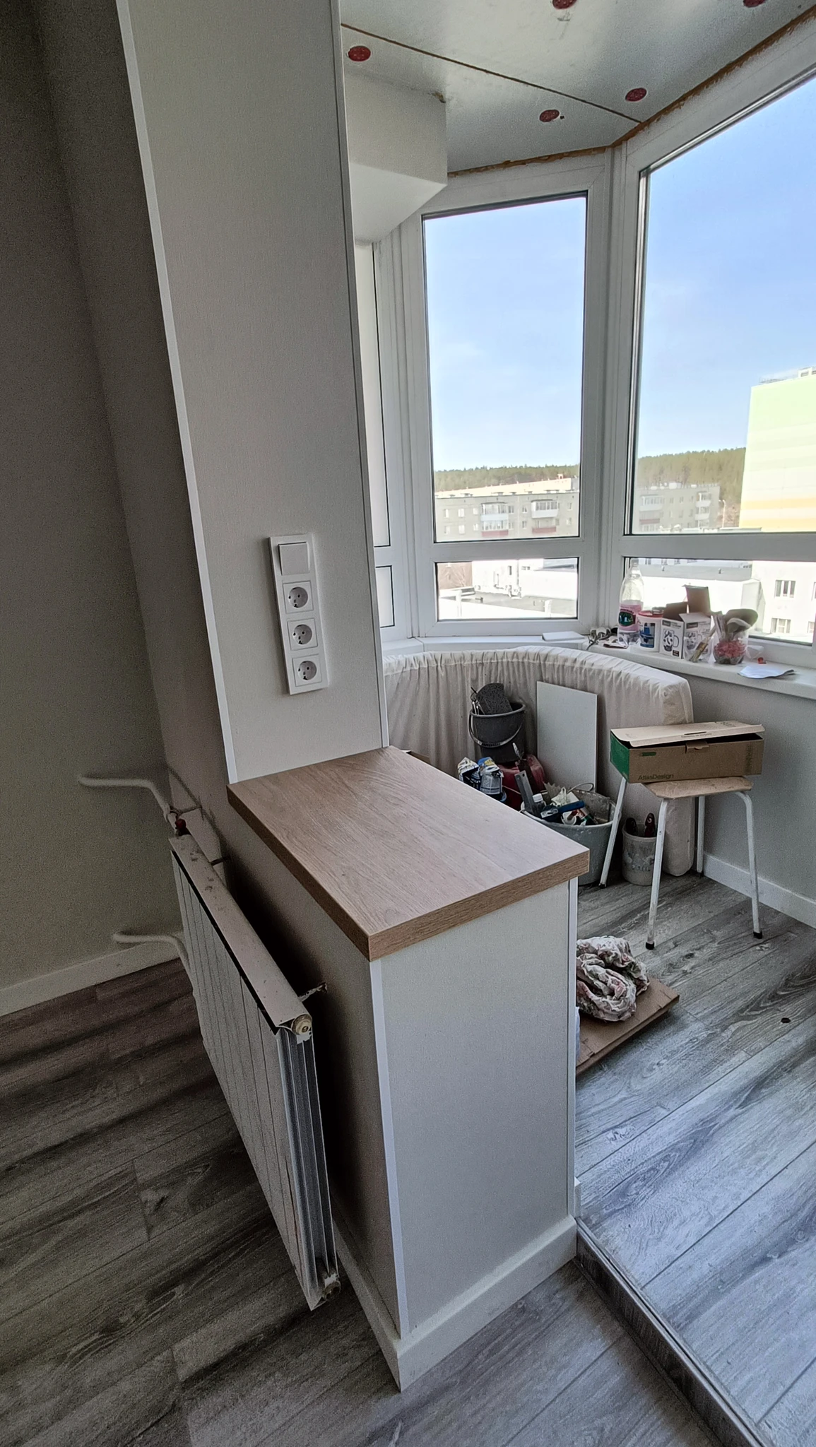 18 апреля приедут потолочники и сделают натяжной потолок в кухню, балкон и санузлы. Останется только потолок в прихожей - но это уже после постройки шкафа, потому что он замороченный будет, т.к. в нём много коммуникаций сходится.