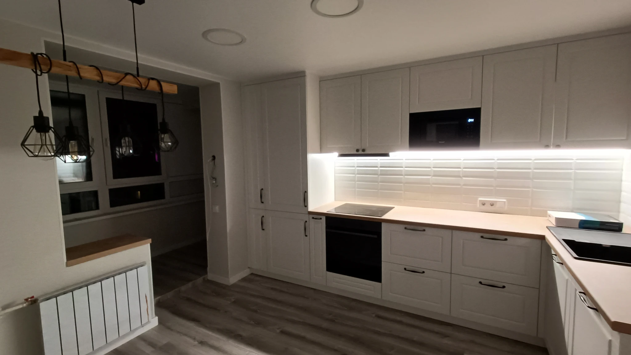 Мне именно нравится, как меняется общая картинка кухни, когда зажигаются эти лампочки над столом. Для яркости и "холодного света" у меня есть светильники на потолке - они очень мощные.