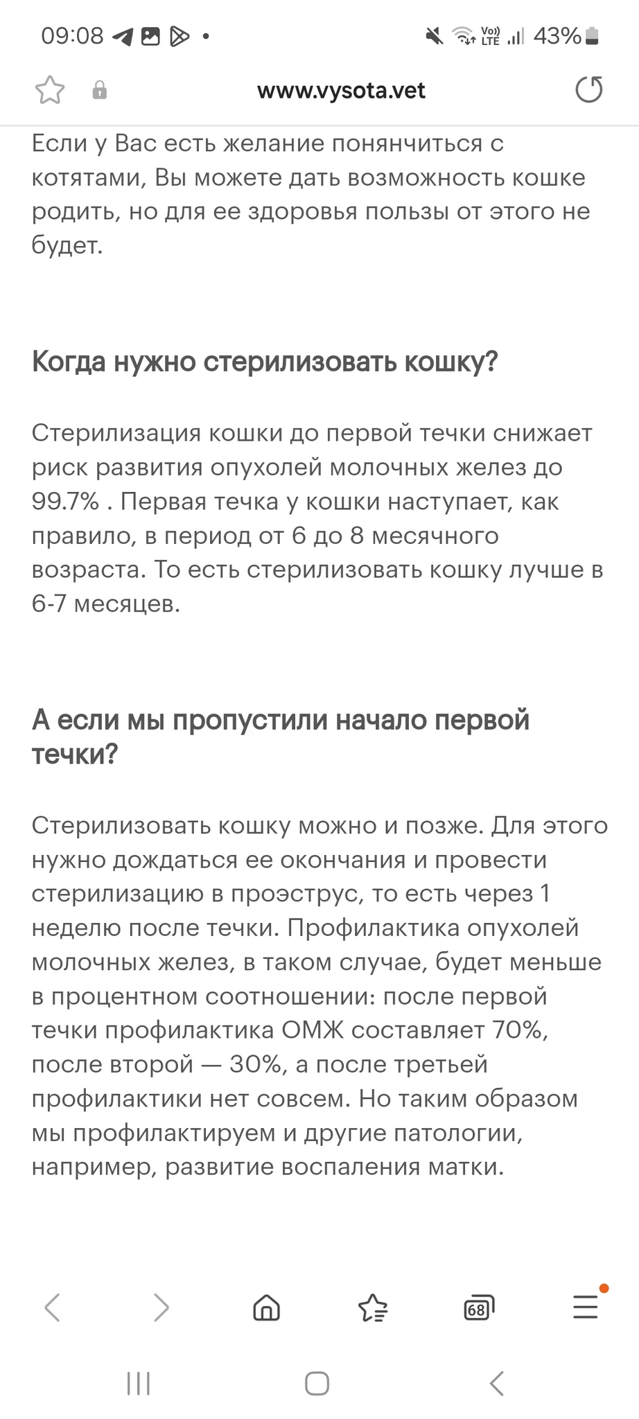 Увидела ответ, что по статистике меньше онкологии у стерильных до первой течки. Пока не могу найти официальную статистику по стерилизованным и рожавшим, чтобы посмотреть проценты. Ещё бы сравнить, если не успеем до первой течки. Только черед две недели получится. Если не успеем, то что лучше, рожать или стерилизация после первой течки с точки зрения болезней?