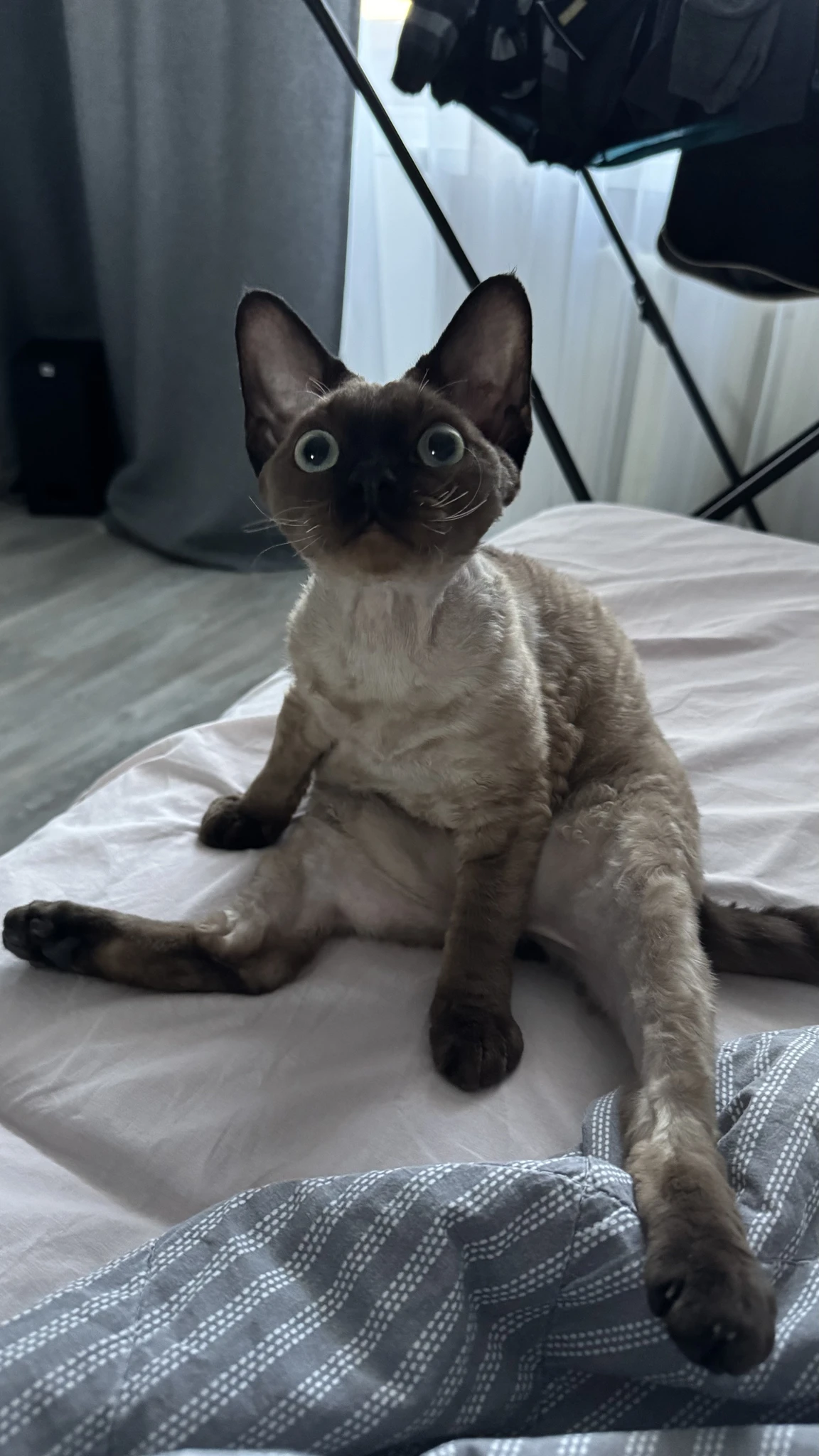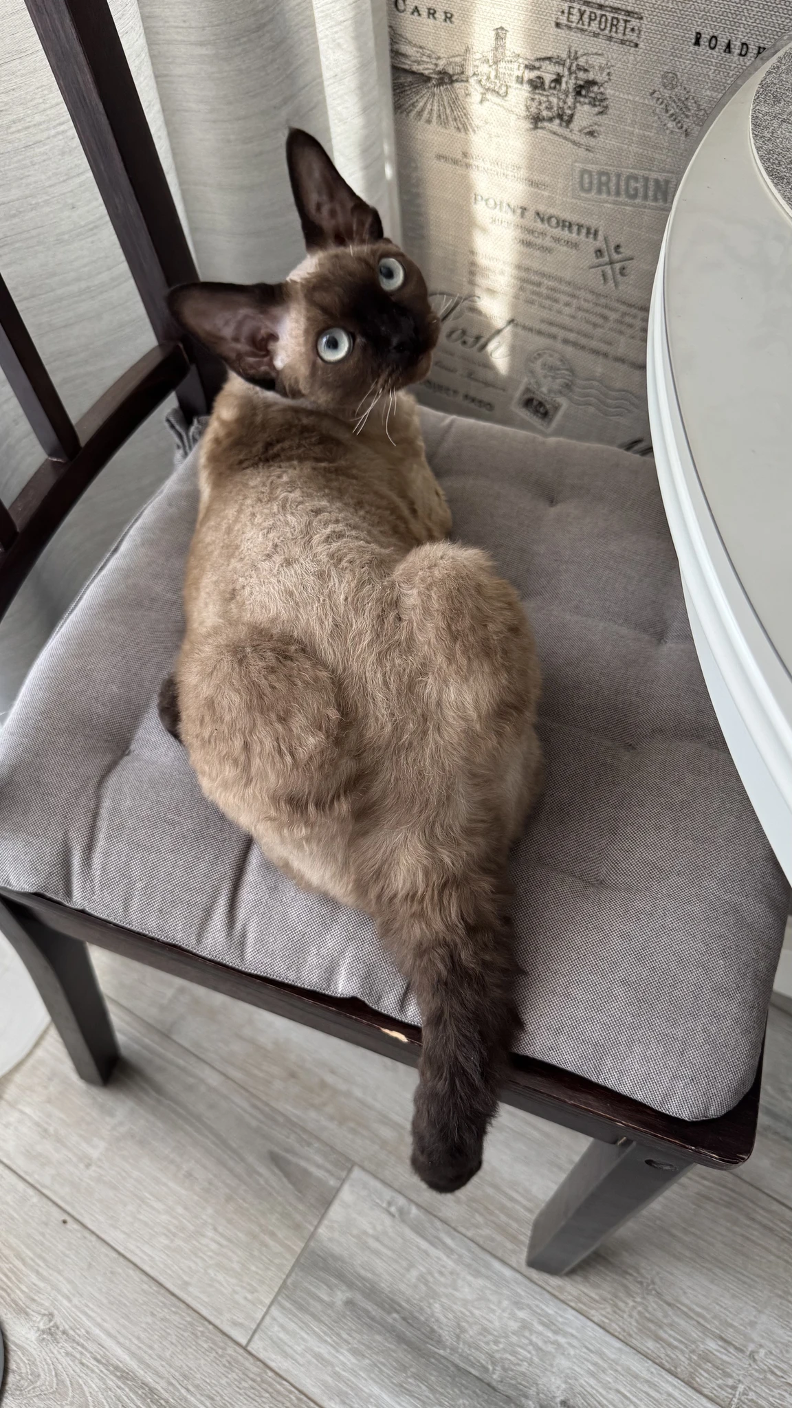 Девон Рекс, он ещё котенок подросток 7 месяцев, сначала у него тоже не было усов, так слегка немного росли коротенькие совсем, постепенно отросли в разные стороны торчат теперь 😄
