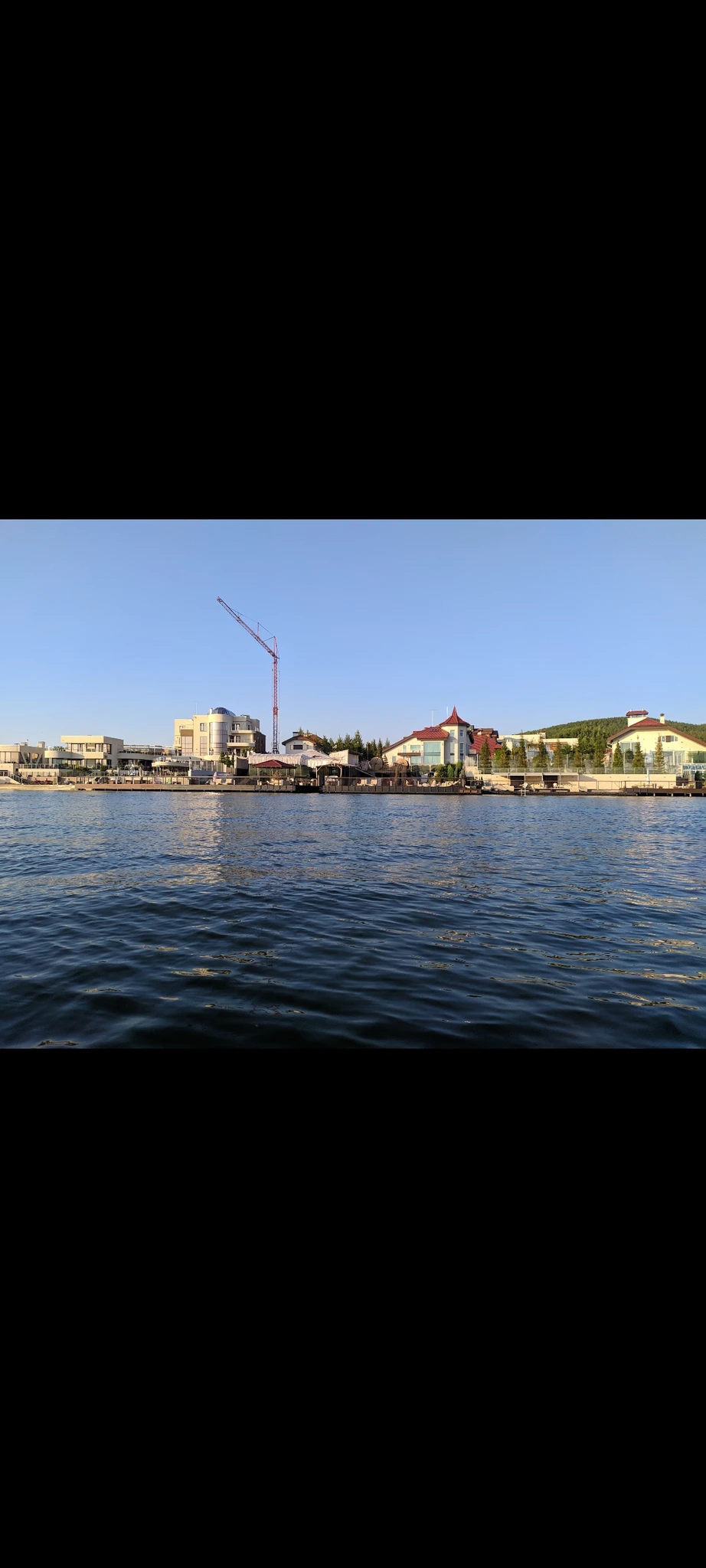 Вот вид с воды на полностью загороженный берег. Где папа в детстве гостил у бабушки и купался на этом пляже. Дом сохранился, но окружён дворцами. А вот выхода к озеру нет.