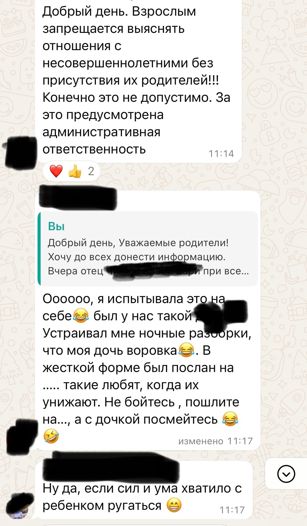 Я удивляюсь, добрая половина женщин оскорбляет меня, мужа, советует учинить драку или наорать на обидчика, со всеми вытекающими. Вы так решаете вопросы? Вы вообще не цените себя, своих родных, что вот так просто советуете опуститься ниже плинтуса? Вопросы в правовом поле решать не пробовали? Я пробовала, у меня получалось! И вам советую. Надеюсь и сейчас получится! Тему можно закрывать.