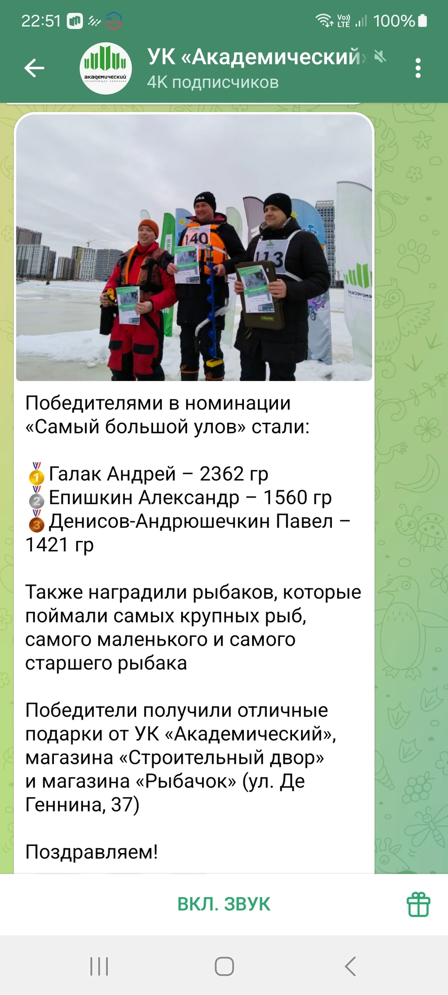 Это ежегодное мероприятие в Академическом. В этот раз было примерно 70 участников, плюс болельщики. Призы в разных номинациях: самая большая рыба, самая первая, больше всего по весу и др. Многие семьями пришли, детей много. Выход на лёд только в жилетах ( можно арендовать тут же).