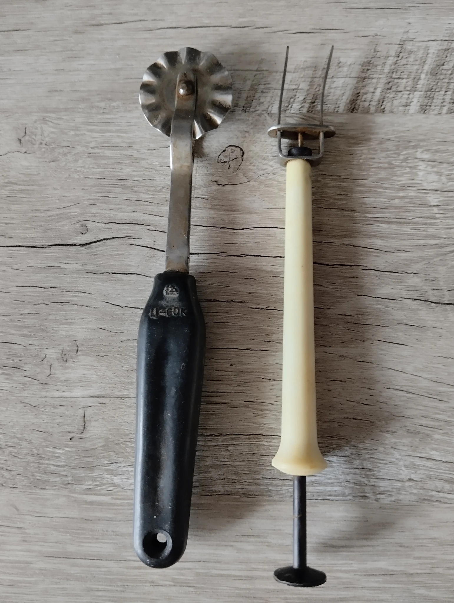 Самое старое из используемого - чугунная сковорода для пончиков, доставшаяся свекрови от ее бабушки (свекрови за 90!) и вилки-ножи начала 19 в, с каменными ручками.