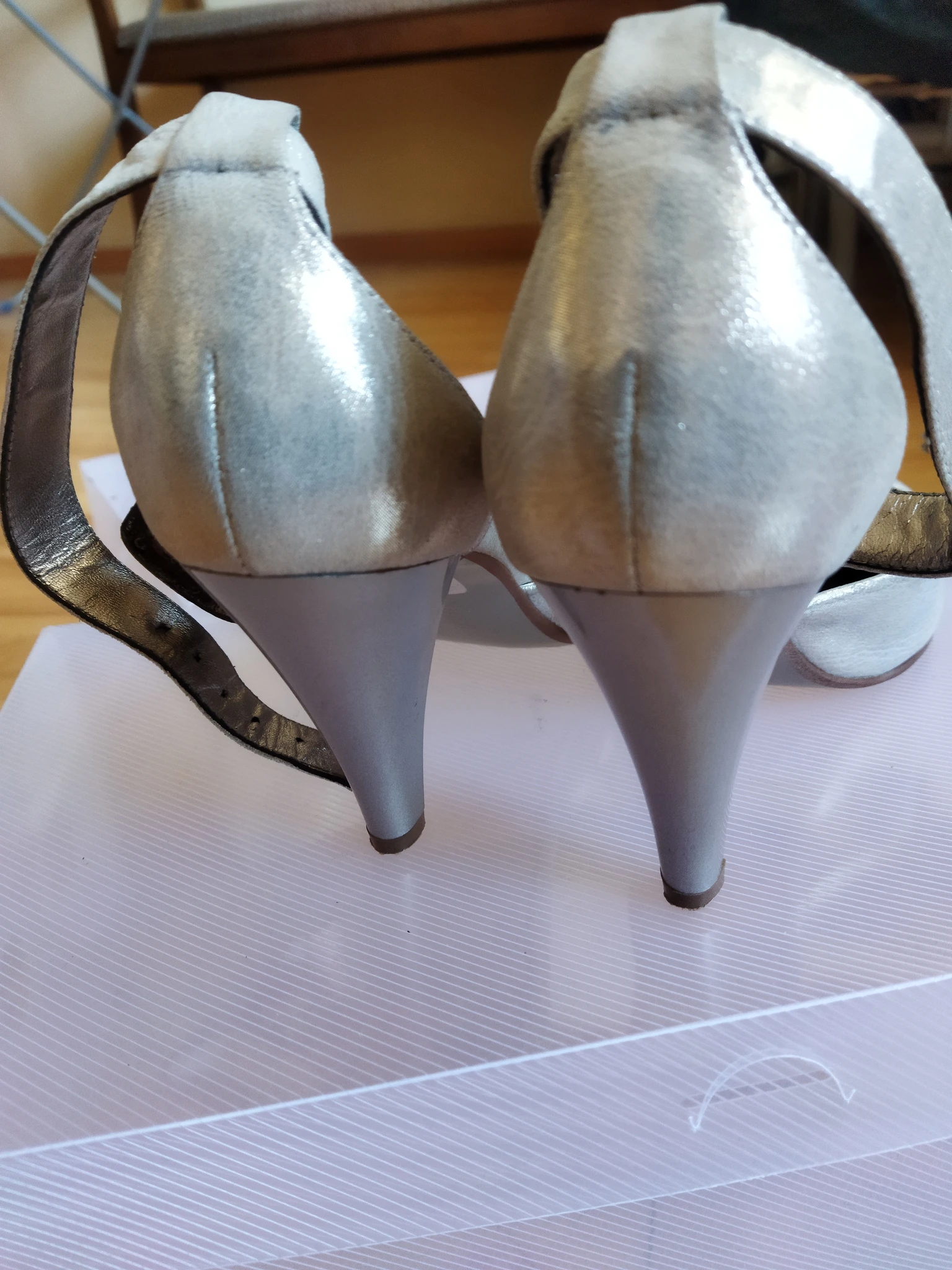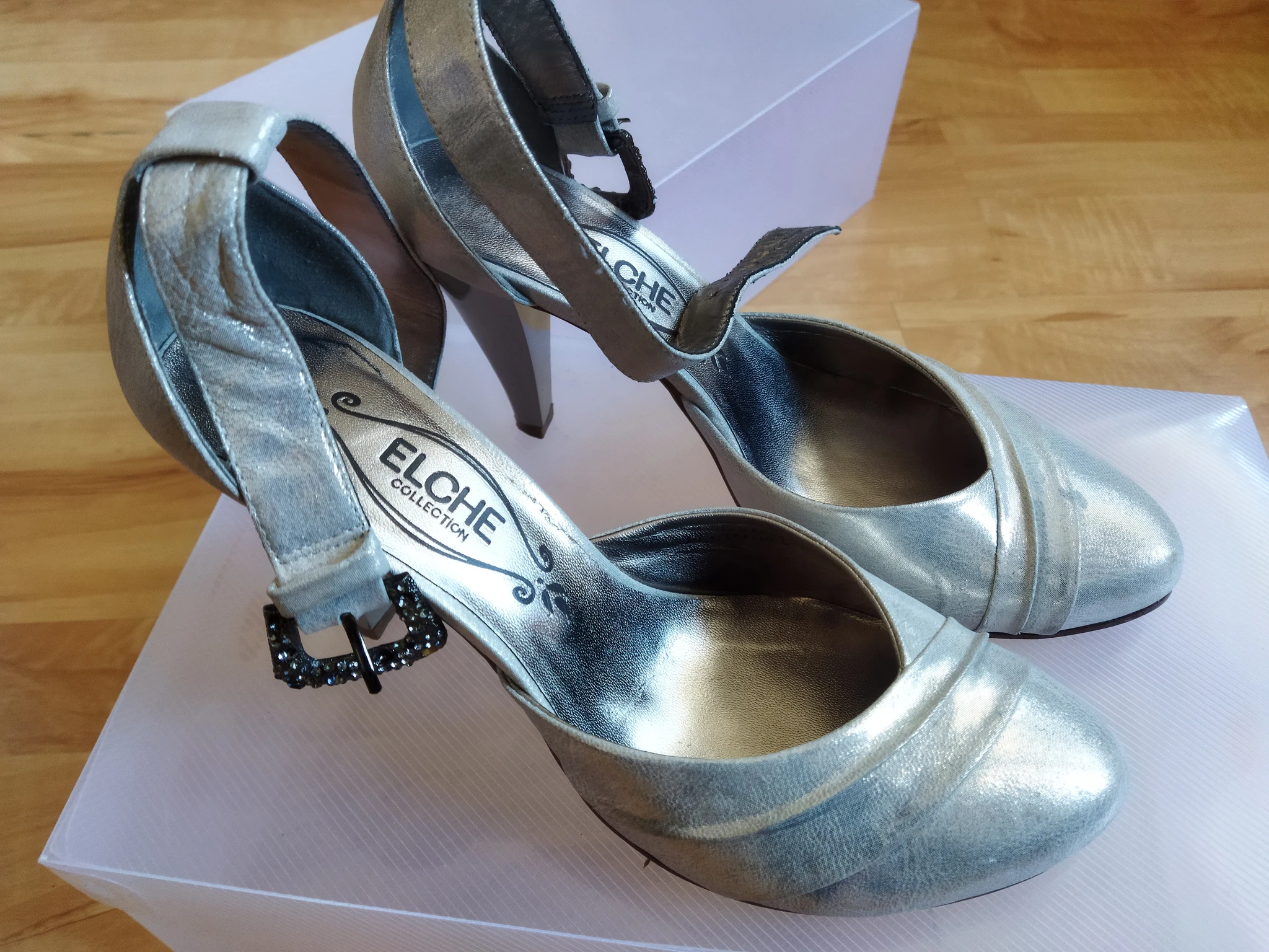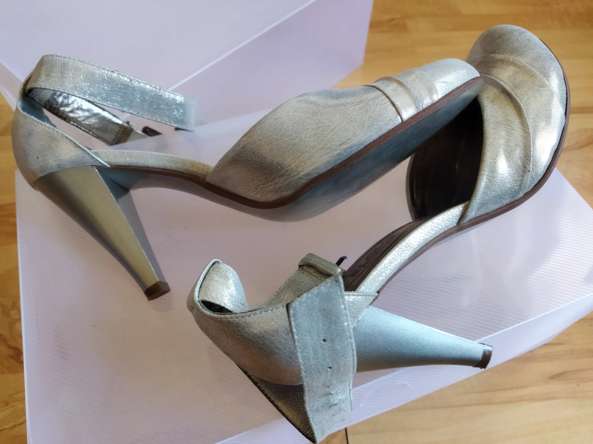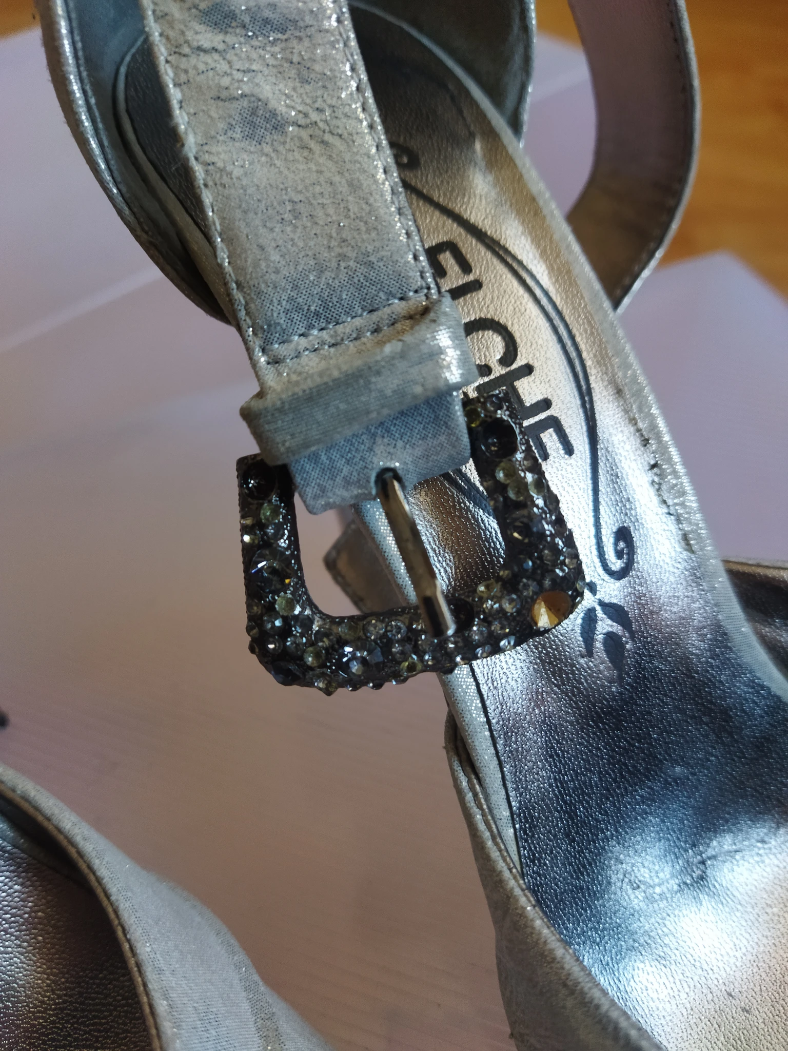Состояние хорошее, каблуки не царапаные, на застежке только стразик выпал.