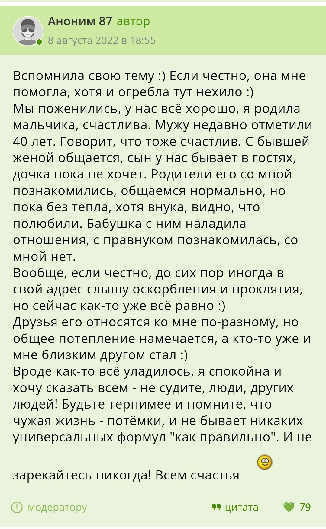 так то совет да любовь. Но 6 лет это слишком маленький срок . Напишите потом через еще 10 лет. Тогда более информативно будет . Как вы счастливы по прежнему и любите друг друга. Может и муж ваш бросивший первую семью, не поступит также с вашей потом, через много лет, когда подустанет и захочется новых эмоций и впечатлений