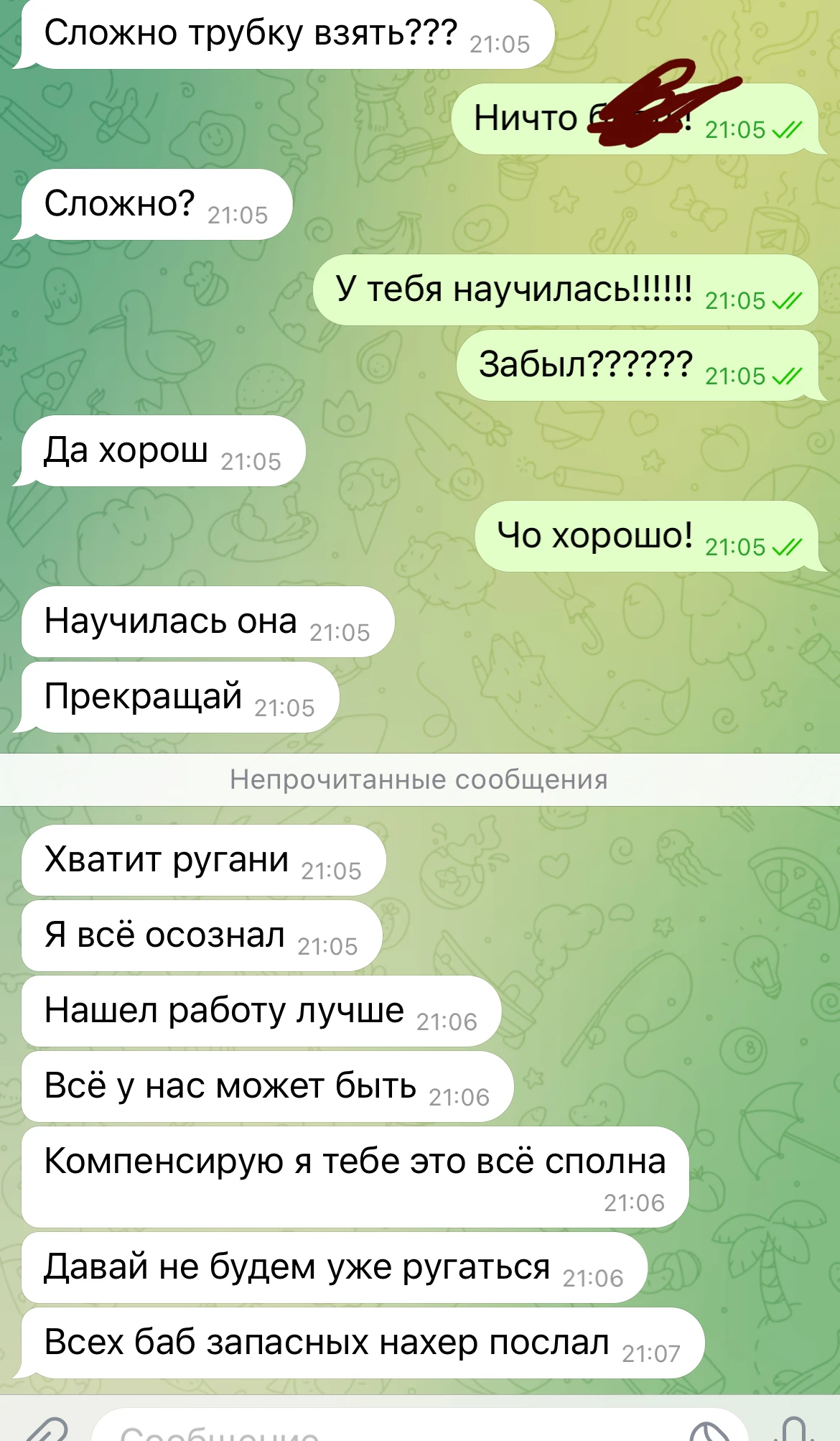 Тем временем бывший, сижу трубку не беру. Как он не брал тогда когда бросил
