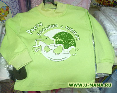 Джемперы из нежного мягкого интерлока подольской фабрики «Умка плюс» с кнопками на плече и воротником-стоечкой. Надпись «Расту большим и крепким». Ясельные размеры, цвета: голубой, розовый, зеленый. Кстати, у этой фирмы много изделий с надписями типа «На 99% идеальный ребенок!» Такая одежка очень популярна у родителей, и они были бы благодарны расширению ассортимента! 250 руб.