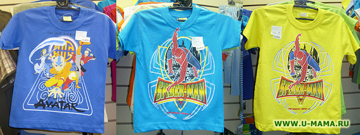 Футболки мальчуковые с человеком-пауком, Шрэком, Аватаром и другими культовыми персонажами, пр-во Турция, размеры 3-8 лет. Качество принта невысокое, цвета блеклые. 160-180 руб.