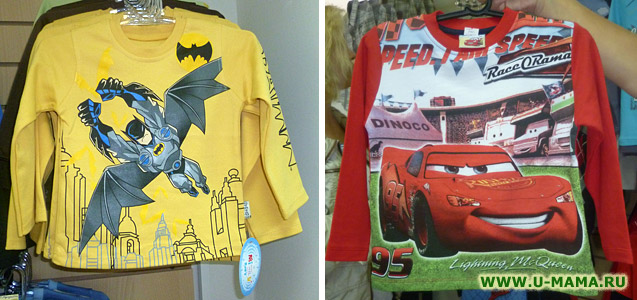 Футболки белые и оранжевые с тачками, размеры 3-10 лет, 480 руб. «Молния Макквин» на футболках светится огоньком, при этом изделие можно спокойно стирать. Как нам сказали, таких футболок в городе больше нет…