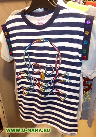 - Футболки от 5-ти до 13-ти лет с длинным и коротким рукавом. Цены: 149, 199 и 299 руб., в зависимости от фасона. Есть «пиратские» футбы на девочек, усыпанные стразами и каменьями, есть футболки-поло.