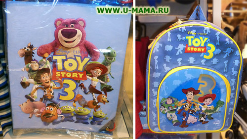 - Маленькие рюкзаки «История игрушек» за 299 руб. За такую же цену большие утягивающиеся сумки-«сменки».