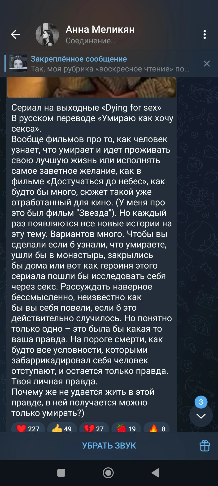Не смотрите, если тема секса и смерти в одном помещении для вас неприемлема.. вторую половину сериала мои слезы катились безостановочно... Для меня это фильм про любовь.