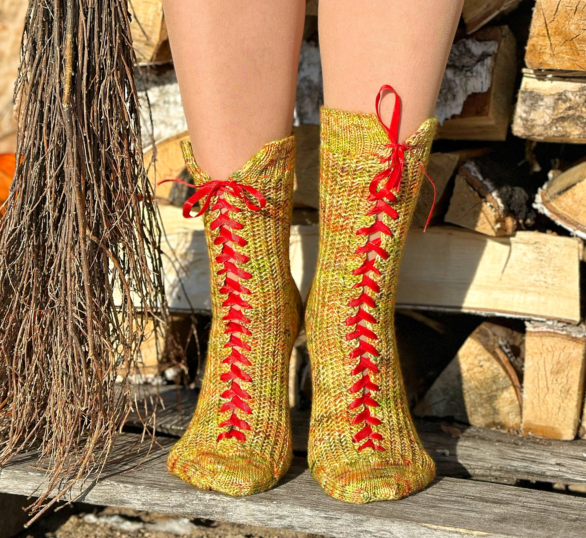 А вяжу из специальной носочной пряжи 75%шерсть/меринос и 25% полиамид. Производитель разный Турция , либо Италия. С шнуровкой ручное окрашивание( не моё)