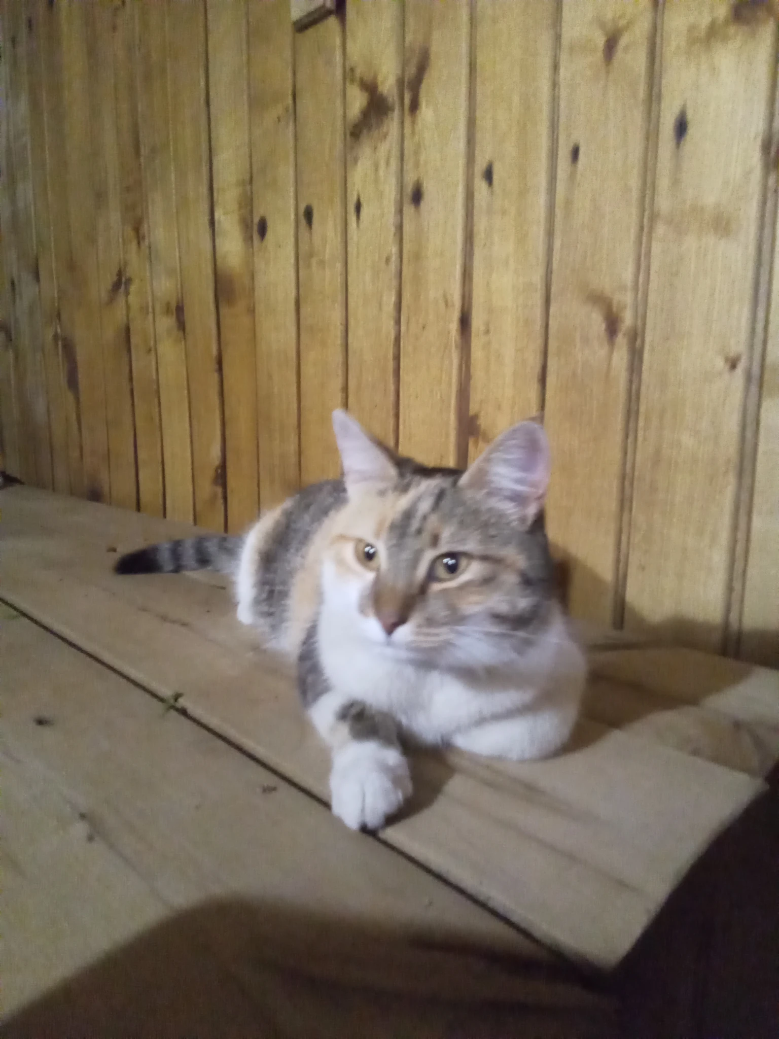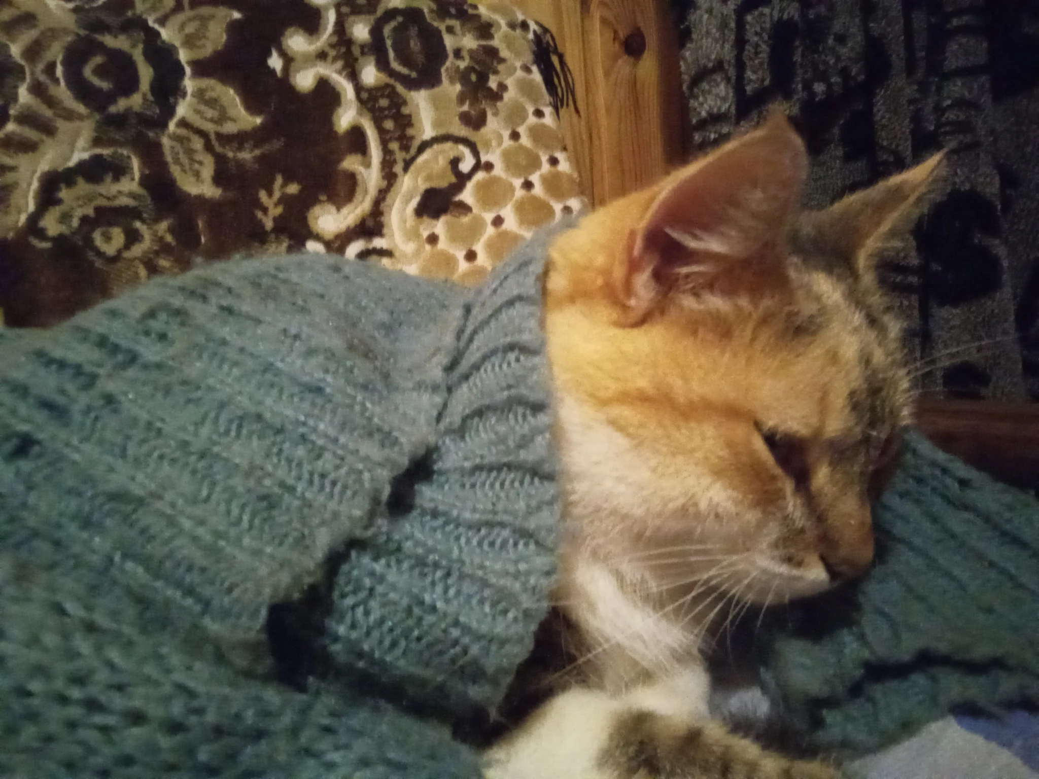 На фото Мусенька наша в бане (она реально приходит греться в баню. Представляете? Может минут 10 лежать на верхней полке. И когда прохладно, всегда спит у нас укрытая...Вот такая у нас теплолюбивая кошечка.
