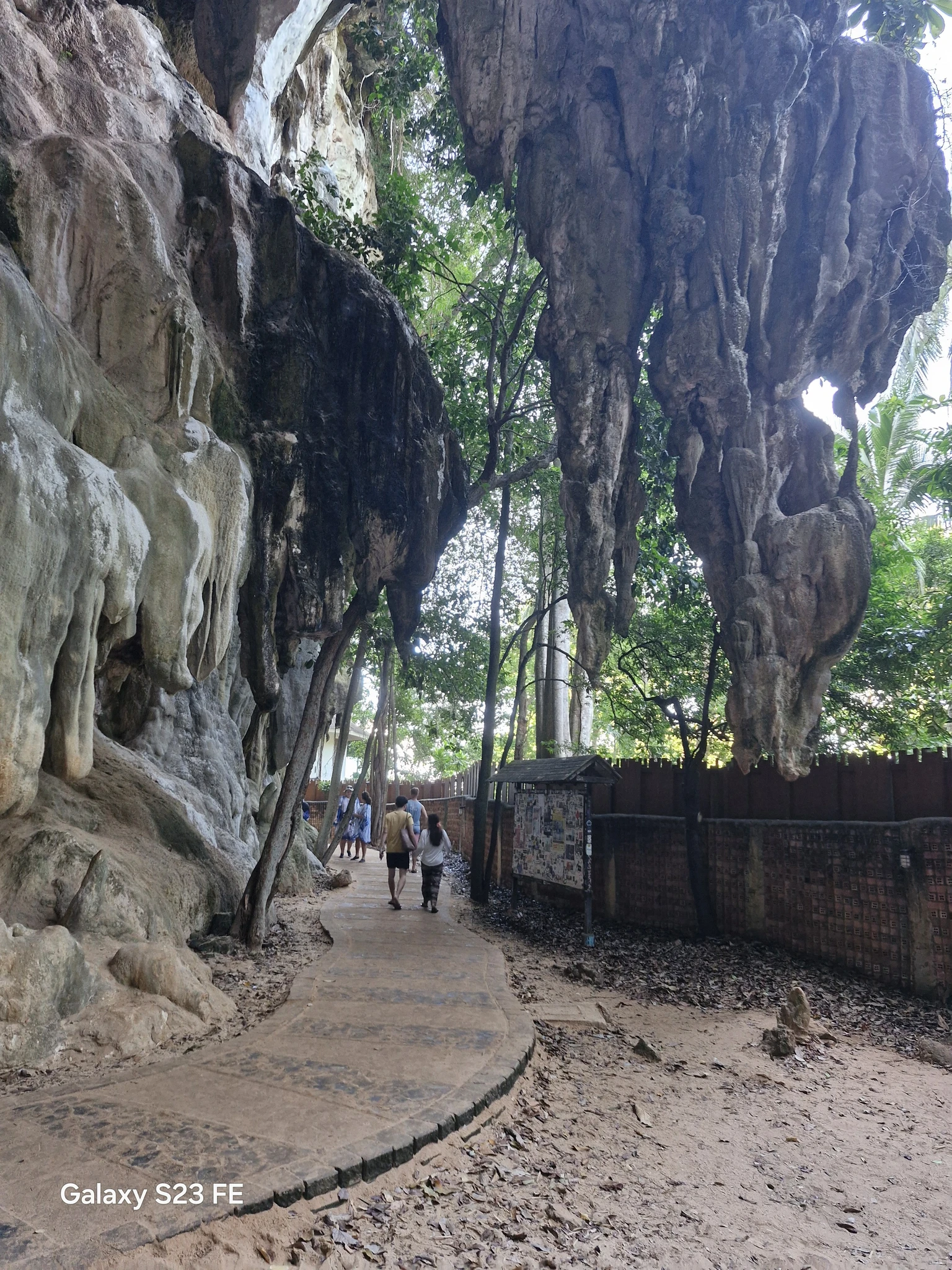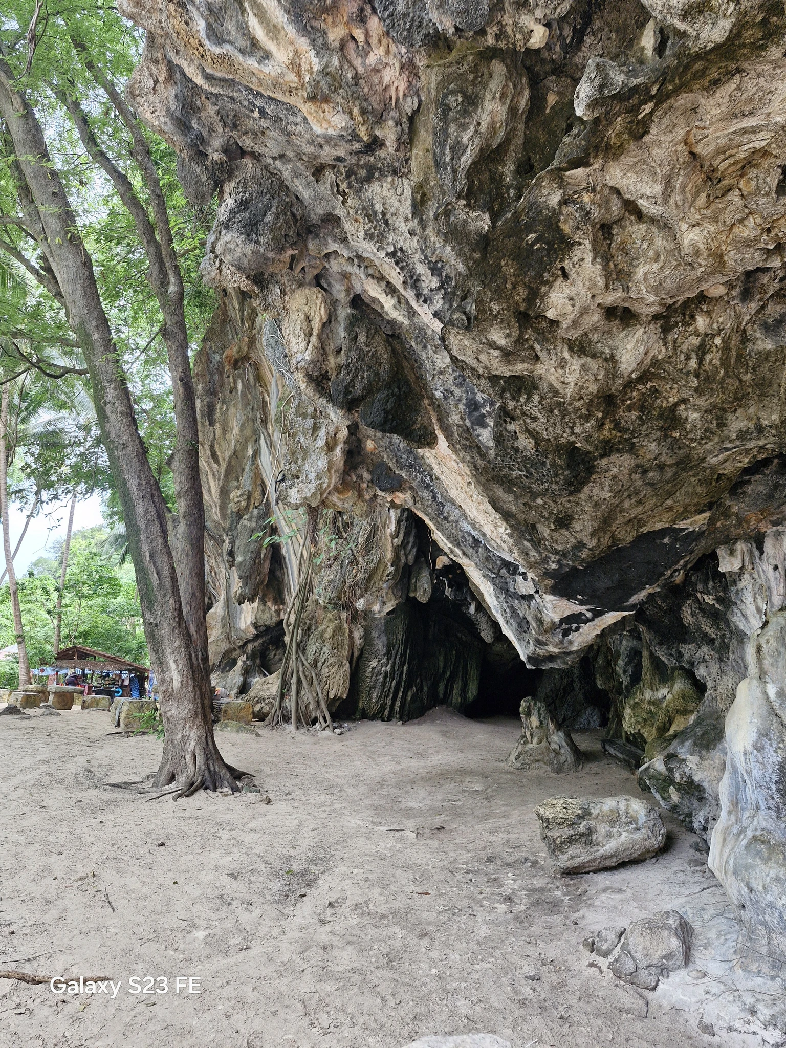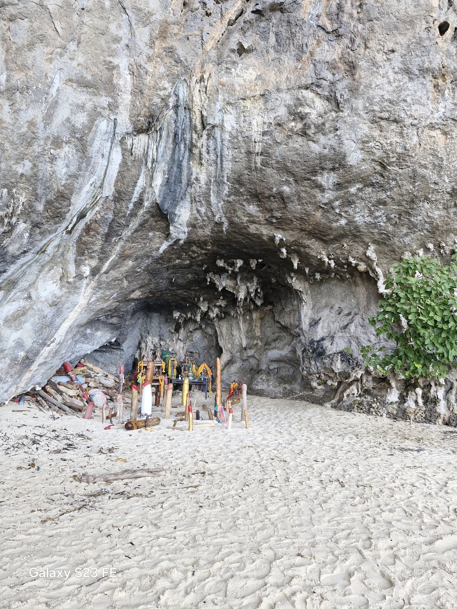 Что именно называется пещерой, я так и не поняла, но проход к пляжу идёт по такой каменной полугалерее, которая иногда нависает над дорожкой вполне внушительными сводами. На самом пляже два углубления, которые, возможно, и есть пещера. Внутри стоят тайские алтари с подношениями. Видимо, святое место. Только несёт от него амиаком очень так бездуховно.