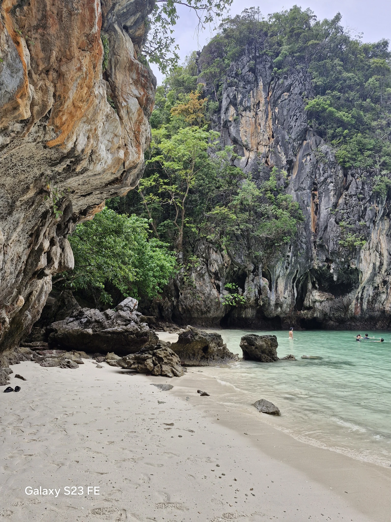 Первая же локация меня сильно напрягла. На достаточно большом участке берега не было свободного места для причала лодок. Поэтому процесс был организован так. Одна лодка прикалывает, выспживает своих туристов и отходит ждать в море, освобождая парковку для следующих групп. Ну и представьте, сколько народу уже сошло на берег и курсировало между пляжем, пещерой и стоянкой плавсредств?!