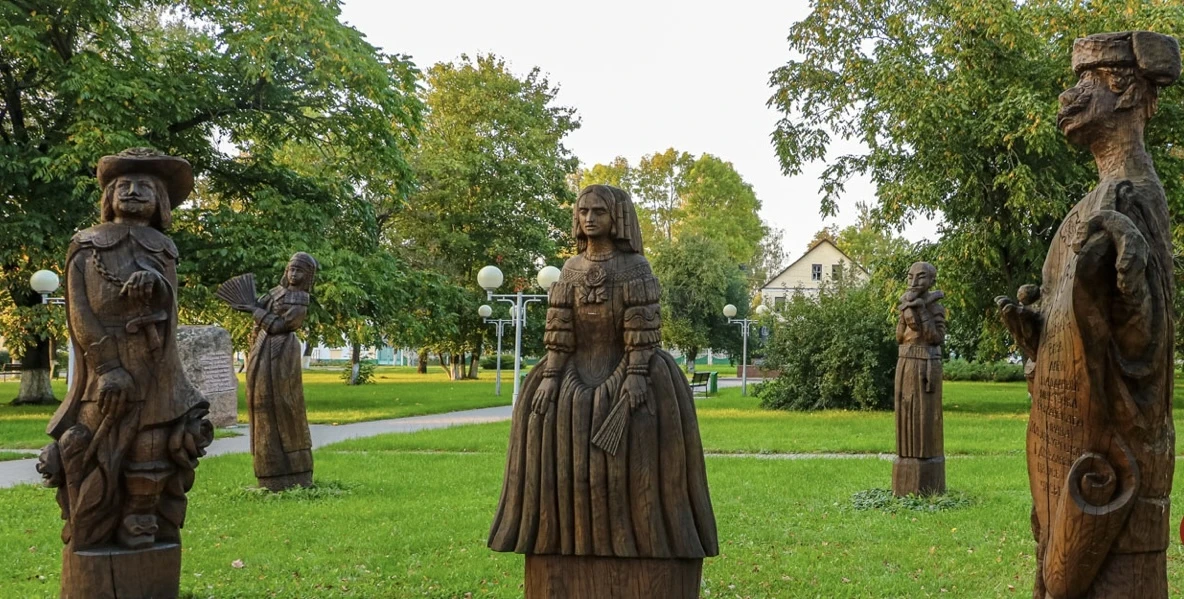 Поэтому купив в местном магазине перекус, устроились в скверике на скамейке. Жуя бутерброды, разглядывали деревянные скульптуры, установленные в сквере.