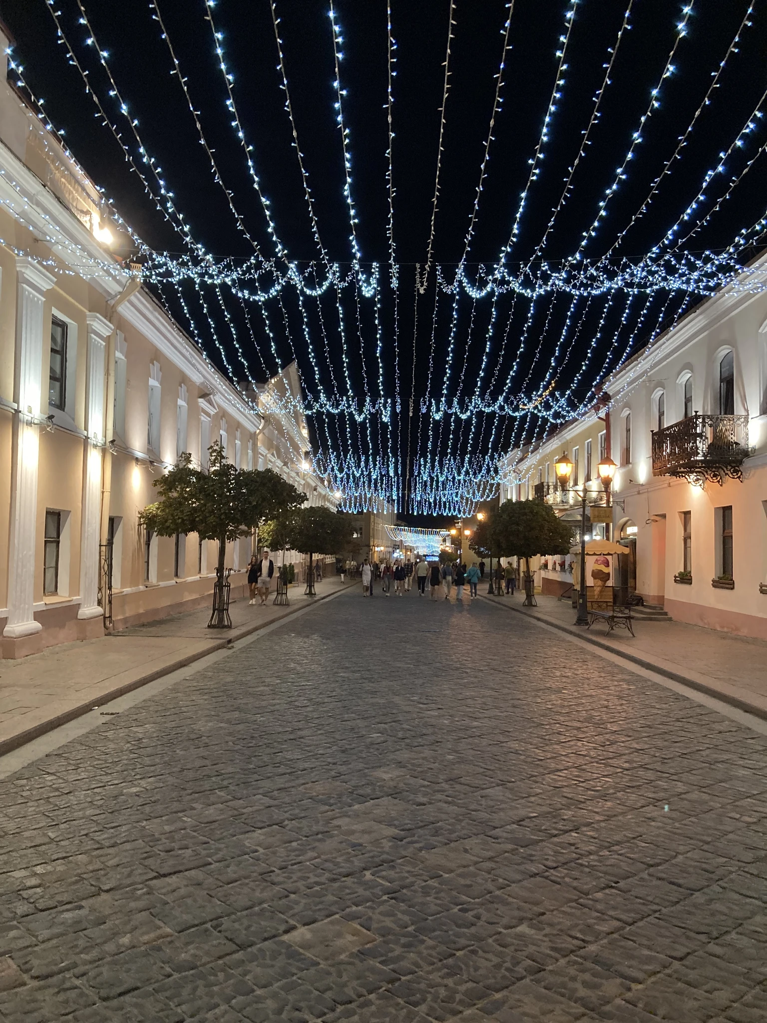 После прошлись по вечерней улице. Это прогулочная зона с красивой подсветкой, кафешками.