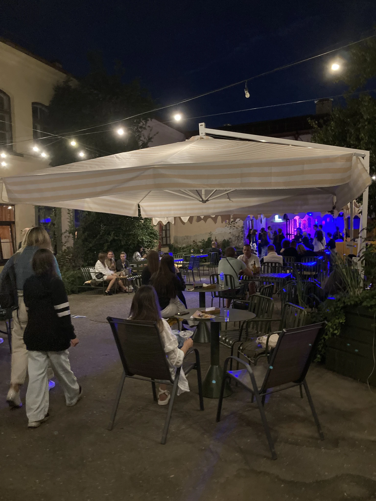 Джезва. Там варят кофе на песке в джезве. Уютный внутренний дворик со столиками, где играет живая музыка.