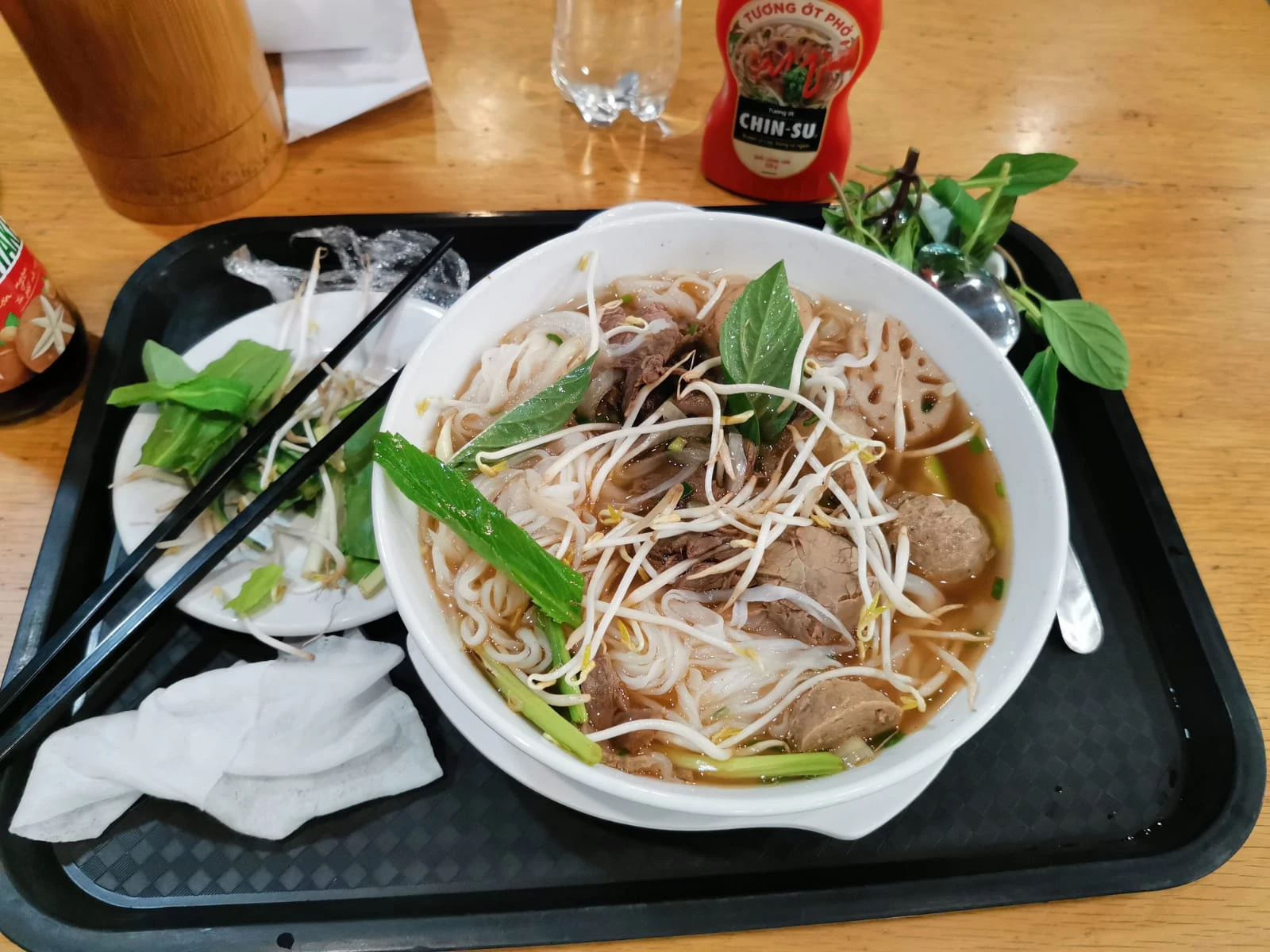 Питание мне показалось ближе к привычному. Мне там проще накормить детей чем в Тайланде. Если только на местную еду ориентироваться. Кафе на каждом углу, на любой вкус, меню от европейского до местного. На улице брали и блины и супы, ни разу ротавируса не было. А вообще негласное правило, если в заведении много людей сидят едят, значит вкусно и недорого. На фото вьетнамский суп Фо-бо. До остроты сами доводить, соусы отдельно. Так что с острым проблем нет.