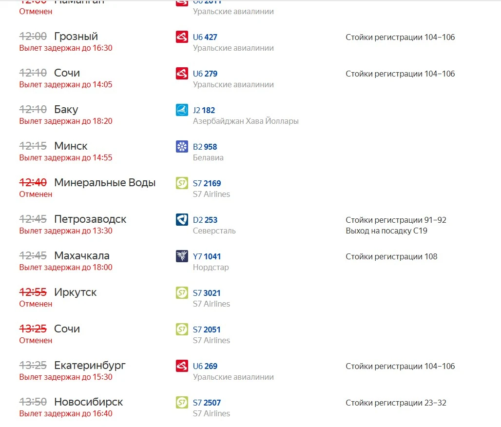— В аэропорту Сочи на вылет задержаны 16 рейсов, 6 — отменены. Несколько московских рейсов задерживаются на 8-10 часов, часть из них отменили. 19 самолётов задержаны на прилёт, 7 — отменены.