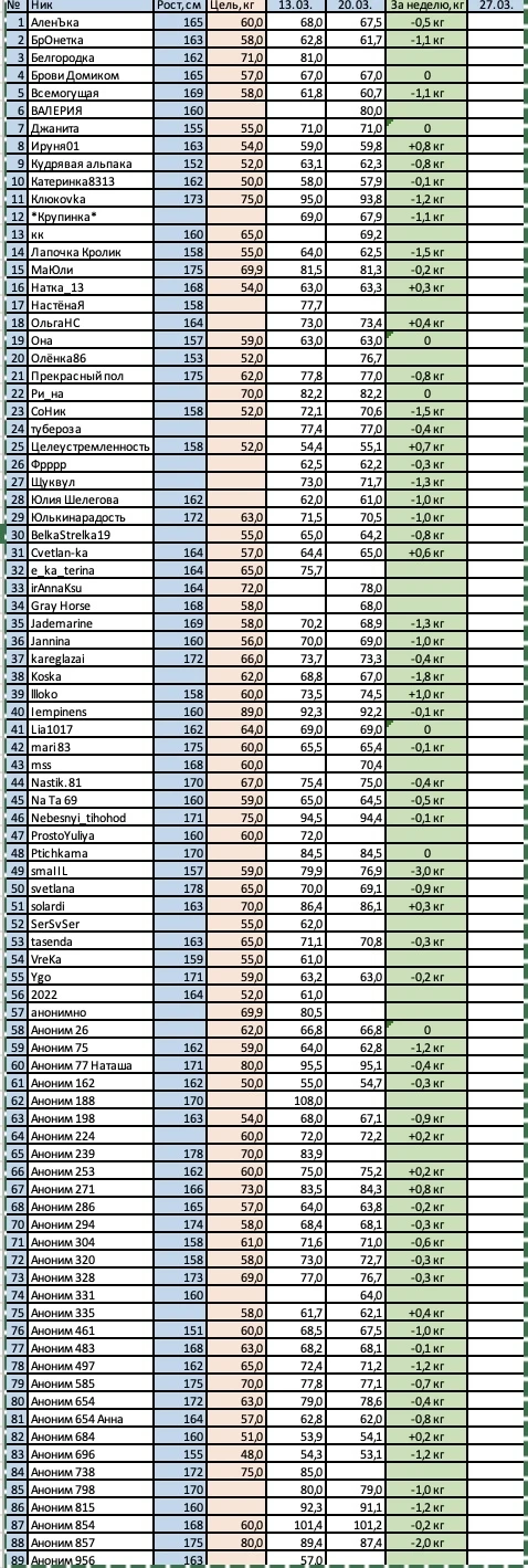 Я автору предлагала , но увы, и это её право, хочет здесь. Наша задача смотреть свою строчку в таблице. Анонимов лучше отсортировать по возрастанию номера. Зачем смотреть других с подобным изначальный весом, ростом или возрастом? Ну что это даст?