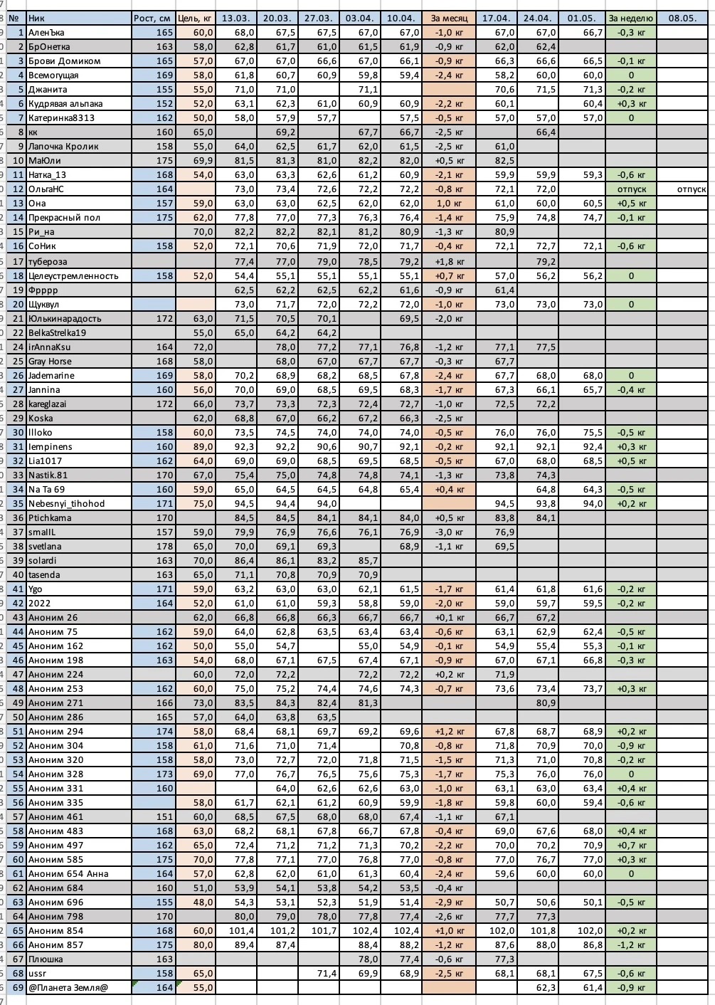 59,5 диеты совсем не придерживаюсь всю неделю. Считаю отлично. После майских всех начну дальше похудение.