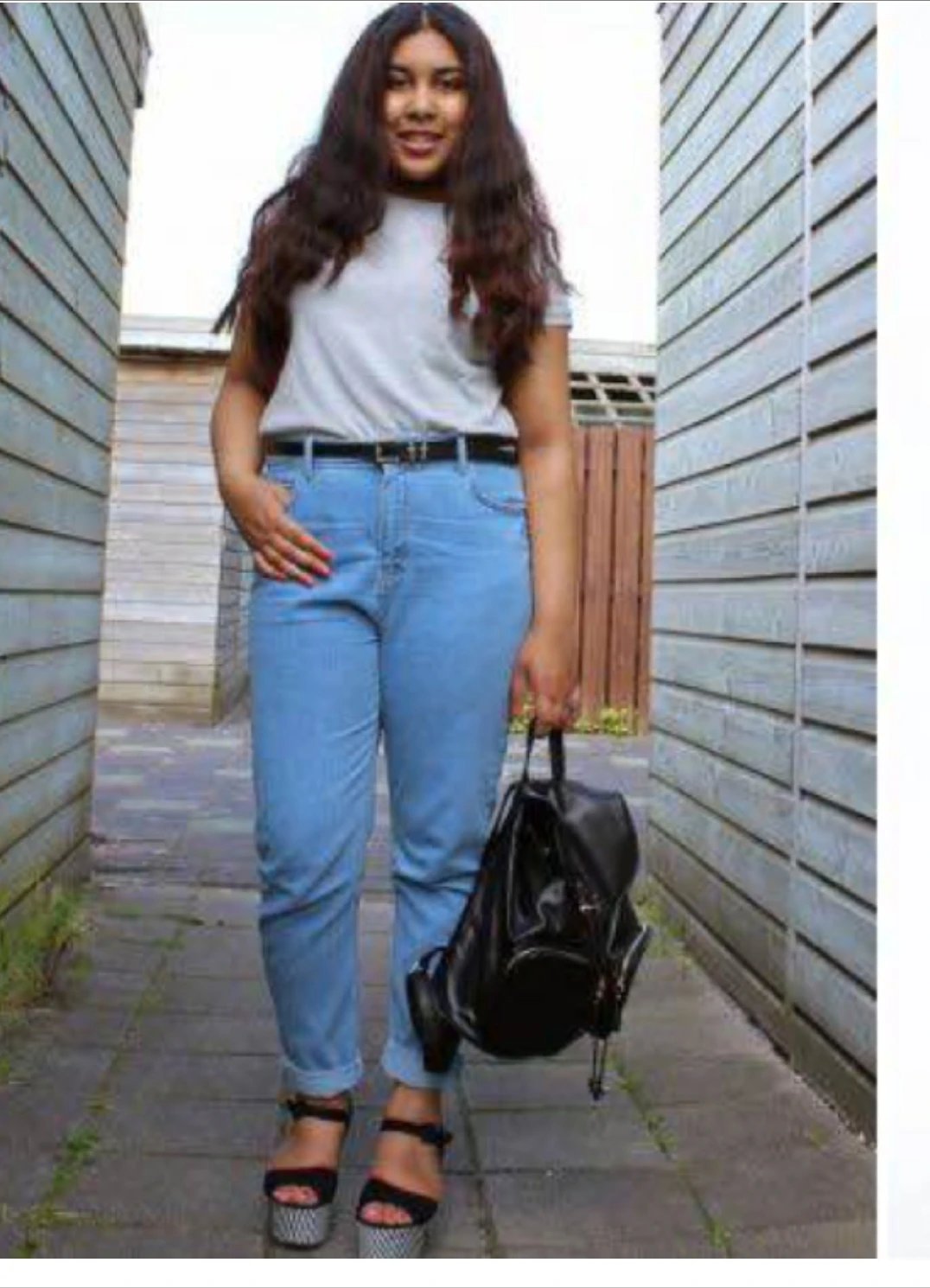 В представленных вами фотках - куча ошибок. Например, женщина в голубых джинсах и белой футболке. У джинсов средняя посадка, пояс с ремнем приходится на выступающую часть живота. Нужна высокая посадка, выше живота. Ремень в цвет джинс.