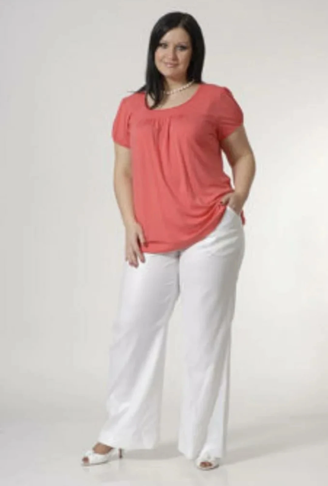 Далее, черная футболка, белые широкие брюки. Посадка на талии хороша. Контраст надо снизить, футболку светлее или брюки темнее. Брюки слишком широкие, надо уже, но не скинни, умеренно широкие.