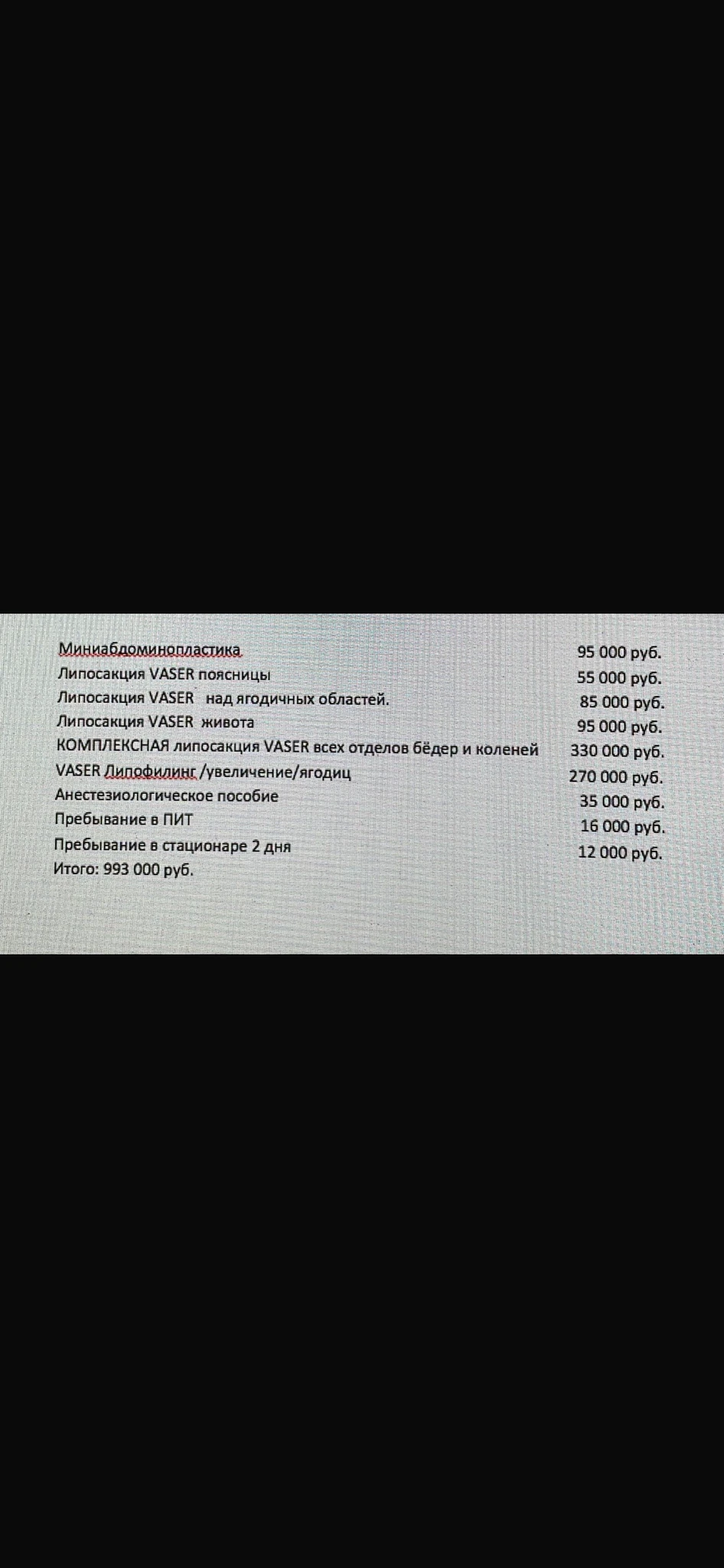 Доктор сказал что идеально будет сделать лицо, грудь и живот. Следующий этап - через год-два, это вайзер липосакция. Я год занимаюсь с тренером 3 раза в неделю, мышцы накачала в какой-то мере, через год уже будет видна картина полная. Сейчас скину то, что доктор порекомендовал. Это при том, что мой вес 47,5 кг.