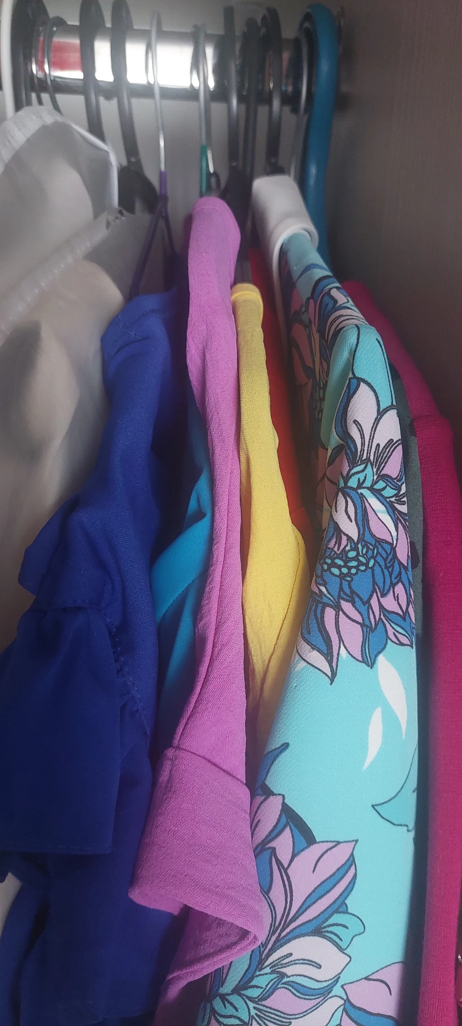 Я люблю яркие вещи. Но также умею сочетать их. Обожаю синий, голубой. Прямо мои цвета. Красный не моё совсем. На днях заказала костюм фуксию посмотрим. Иногда надоедает и ухожу в спокойную гамму.